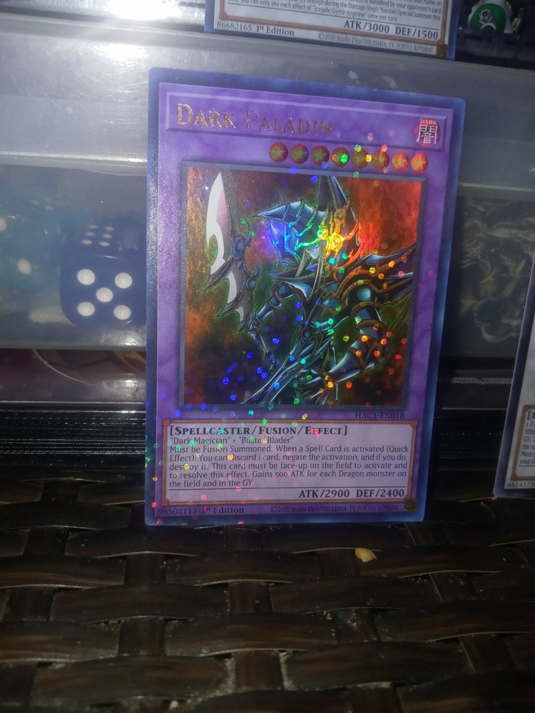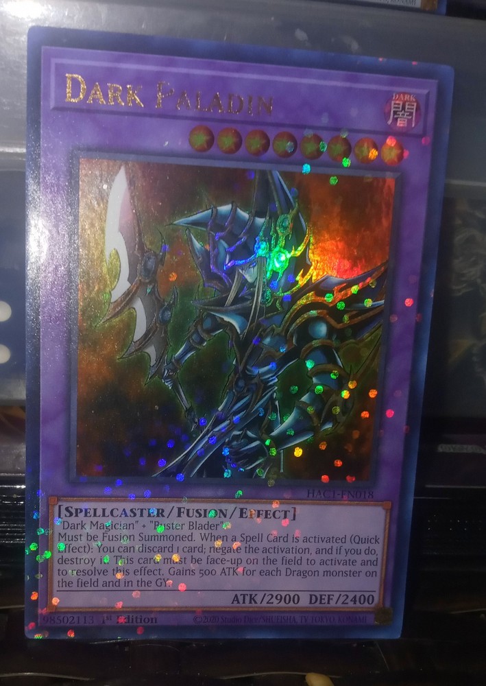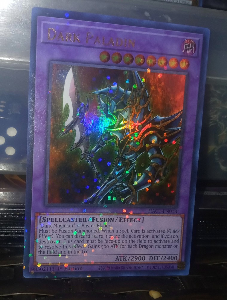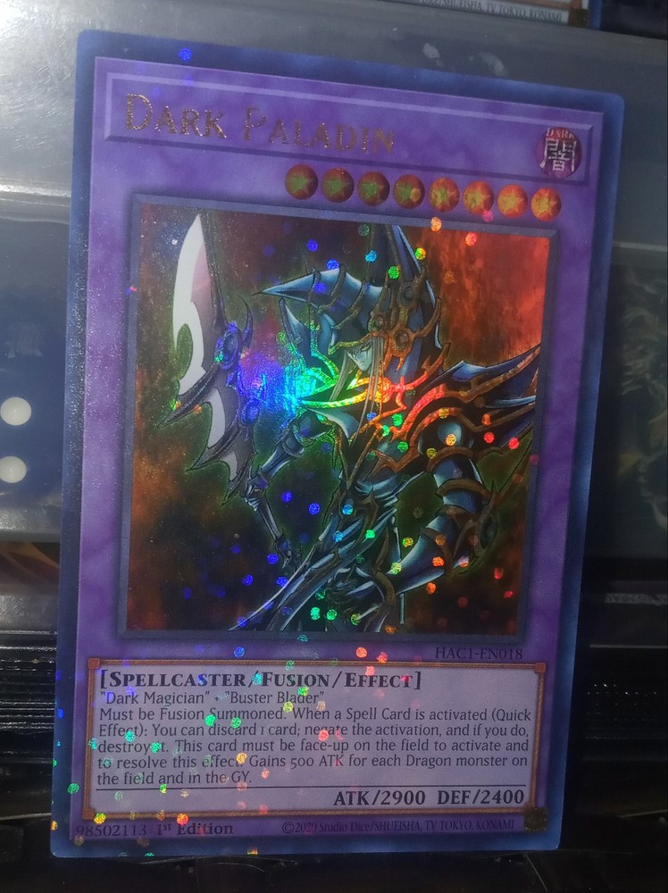 The "Dark Paladin" card from Hidden Arsenal: Chapter 1 is a powerful Spellcaster-type Fusion monster in the Yu-Gi-Oh! TCG. With a high Defense of 2400 and an impressive Attack of 2900, this card is a formidable addition to any deck. It is a Duel Terminal Technology Ultra Rare card, making it a sought-after collectible for fans and collectors alike. The card features both the Dark attribute and 1st Edition printing, adding to its value and appeal.
