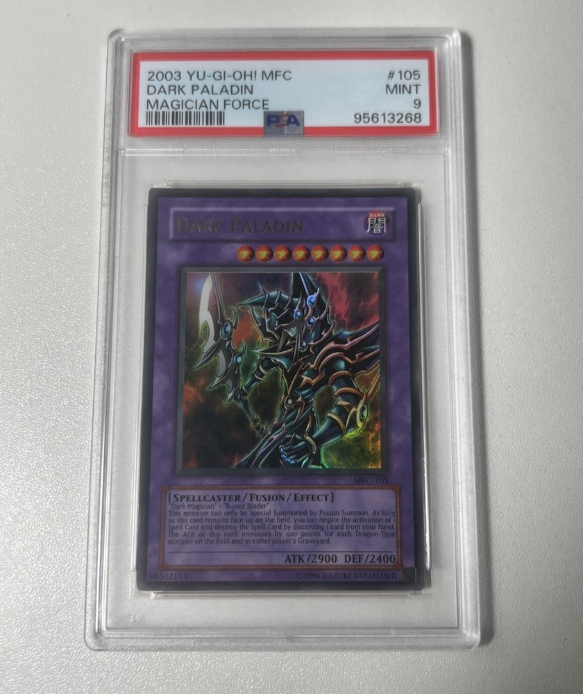 For Sale: Title: DARK PALADIN Set: MAGICIAN FORCE Notes: FOIL Year: 2003 Condition: This card has been professionally graded by PSA an unrestored 9 MINT If you have any further questions please email me before bidding. Please note that if something is not specifically described or pictured as being part of this auction listing, then it is not included. MAKE AN OFFER POLICY: Just because we have "make an offer" on our listings does not necessarily mean we are willing to accept an offer less than our buy it now price at any given time. There are a lot of factors that go into when we will accept an offer and how much we are willing to discount the item: like how long the listing as been up, current selling prices, how many items you are trying to purchase, etc. Please don't email us asking "What is the lowest price you will accept?" because we will not answer it. Our policy is that if you don't want to purchase the item at the current buy it now price, it is up to the buyer to make a reasonable offer on the item. We rarely send counter offers so if you really want the item we suggest you make your actual best offer and leave it at that. RETURN POLICY: We offer a 30 day return policy under certain circumstances and at the Seller?s sole discretion. The original shipping charges are not refundable and there is a 20% restocking fee. The item(s) will need to be returned in the original condition they were shipped out in. COMBINED SHIPPING: Domestically, we do combine shipping on almost all of my items with the exception being very large or expensive packages. There is minimum handling charge of $1.00 for each additional loose comic and $3.00 for a graded book. For larger items the final shipping price depends upon the size and weight. In order for us to combine shipping you do need to wait for us to send you a combined invoice before paying. INTERNATIONAL BUYERS ? PLEASE NOTE: We now ship exclusively through the eBay Global Shipping program. They will send you the final invoice which will include all shipping and import fees. We cannot alter an invoice, change shipping methods, remove the import fees or provide any additional shipping discounts so please do not ask us to do so. SHIPPING POLICIES: We use PayPal Click 'n Ship so the delivery confirmation number is automatically emailed to you as well as stored on eBay when we print up the shipping label. So please check your account instead of emailing us for the shipping info. As per eBay and PayPal rules we are required to ship to the address on the PayPal payment. There are no exceptions to this rule so please do not ask. On average we ship five times a week so most packages are shipped out within 1 business days of payment being received. Please keep in mind we have no control over the Post Office so the final delivery time depends upon them. Domestic combined shipping is available for multiple purchases. There is a minimum $1 handling fee for each additional item. The final total depends upon the size of the actual items purchased so email for a full quote before buying. In order to receive the shipping discount you need to wait for us to send you a combined invoice since eBay's system does not do this automatically. If you pay without waiting for a combined shipping invoice there will be no discount so please wait. All international packages are shipped via the eBay Global Shipping program as stated above. GRADING POLICY: Please keep in mind that grading is a matter of opinion and not an exact science. As you can see from my feedback the vast majority of buyers are happy with my grading. However if you are unfamiliar with how we grade (or just picky) you should always ask questions before bidding. We do not accept returns just because you feel the item is in VF condition and we graded it as VF+. We strive to be as accurate as possible but have found you can't please everyone and some people are just plain unreasonable. COMMUNICATION: If there is a problem with your order always email me first before leaving feedback or opening a dispute. It is never our intent to "rip" anyone off. But if you don't make us aware of the problem we can't fix it. Also keep in mind that this is a Mom and Pop operation and not a large business with multiple employees. We try to answer emails as quickly as possible but sometimes we are just not around. So we will get back to you as soon as possible and appreciate your patience. Remember, collecting should be fun.