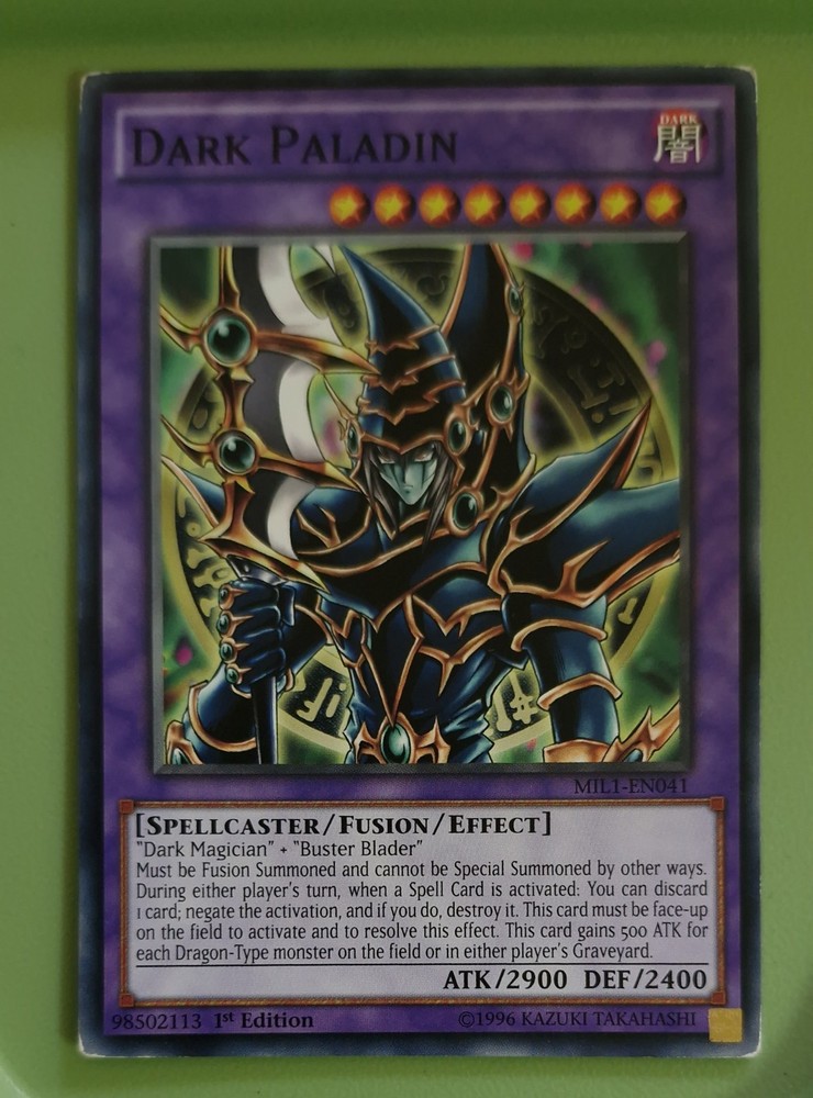 Unleash the power of Darkness with the Dark Paladin MIL1-EN041, a must-have for any Yu-Gi-Oh! TCG enthusiast. As a Spellcaster card from the iconic - Yugi - set, it holds a special place in the game's lore and strategy. The card's distinct attribute of Darkness adds a formidable edge to your deck, allowing for creative play and competitive advantage. Konami's craftsmanship ensures the quality and authenticity of this 1st Edition collectable. With card number 98502113, this piece is a tangible slice of Yu-Gi-Oh! history. Whether for play or display, this card is an excellent addition to any collection, honouring the legacy of the game.