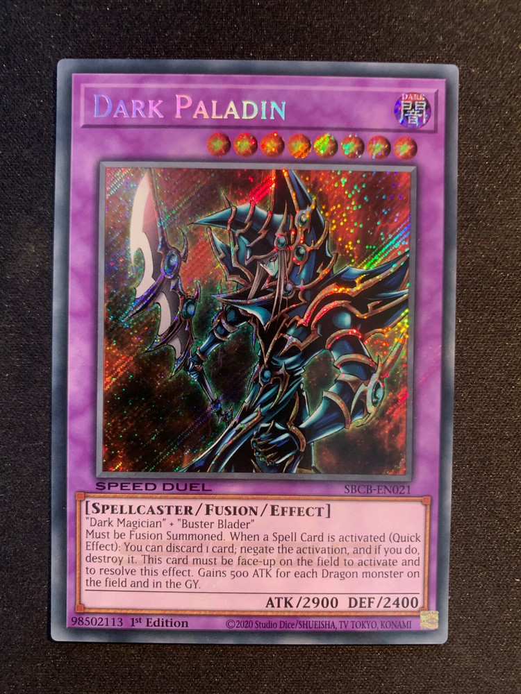 Dark Paladin - SBCB-EN021 - Secret Rare - 1st Edition - Speed Duel N/M Card is 1st Edition Cards are in Near Mint Condition Combined Shipping is offered on all of my TCG Listings. When Checking out with multiple cards in your cart, click ‘Request total from seller’. This will allow me to combine the shipping for multiple cards if purchased together. If this does not show up for you, then please message me and I’ll create a listing for your order. Any Further Questions Please Message Me Thanks