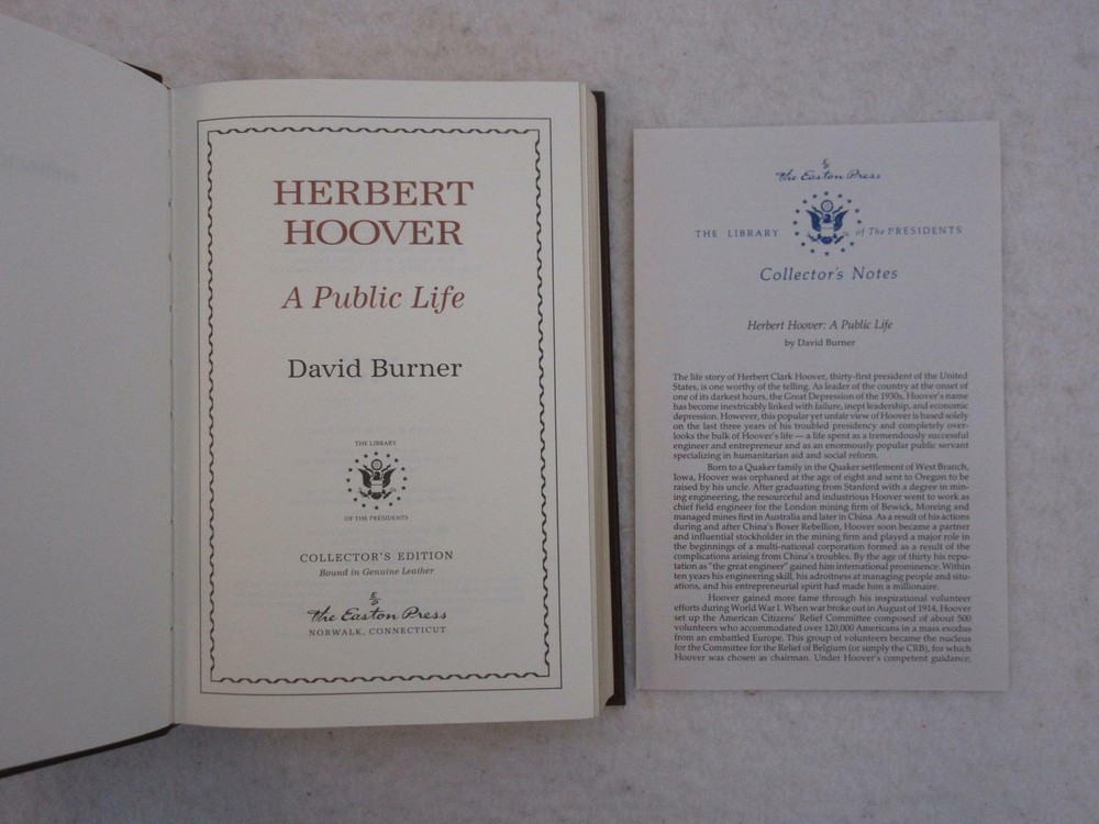 David Burner HERBERT HOOVER: A PUBLIC LIFE 1996 Easton Press Leather Presidents Library In near fine condition. Includes Notes. Please examine photos for details. Condition: We strive to describe and photograph the condition of every item as accurately as possible. Photos are of the actual item that is being sold. Please examine the photos carefully for any condition details and possible flaws. Best Offers: Items are available for offers only after being listed for 30 days. We consider all offers in relation to current market values. We try to respond almost immediately to most offers. Most of our counteroffers are firm but we are open to bargaining. Shipping for US Customers: We combine shipping. When ordering multiple items from us please request a total before paying. We charge postage based on weight plus $1 for each eBay listing. All of our orders are packed carefully to prevent damage during shipment. We ship most of our items within 24 hours. Shipping for International Customers: All international orders are shipped via Ebay's Global Shipping Program. IF AN INTERNATIONAL CUSTOMER IS INTERESTED IN ORDERING MORE THAN ONE ITEM please do not Buy It Now or use the Make An Offer option on the listing. Rather message us first with a list of the items desired along with any offers. After we agree on prices we will combine all the orders into a single listing at the agreed upon total price. This will save you significantly on the cost of shipping. Contact Us: We are available 7 days a week and are happy to answer any questions you may have. THE simple solution for eBay sellers.