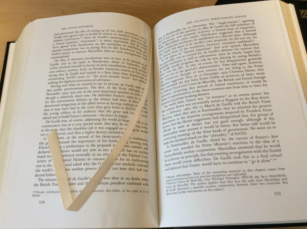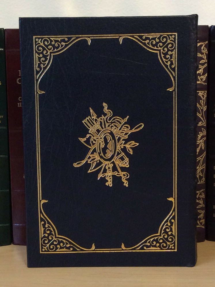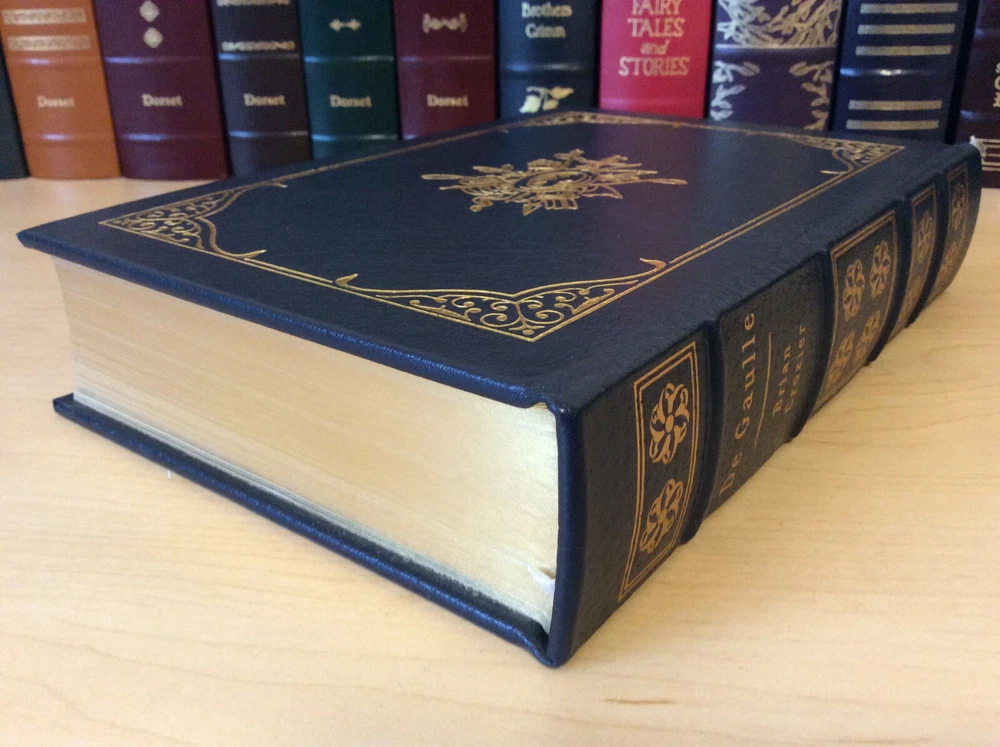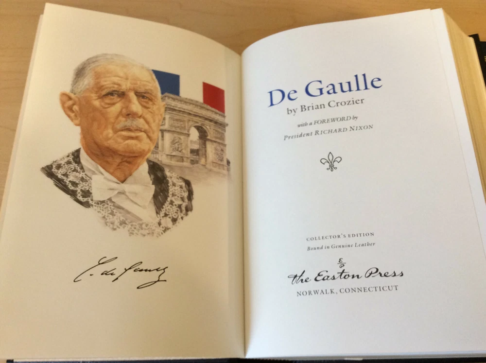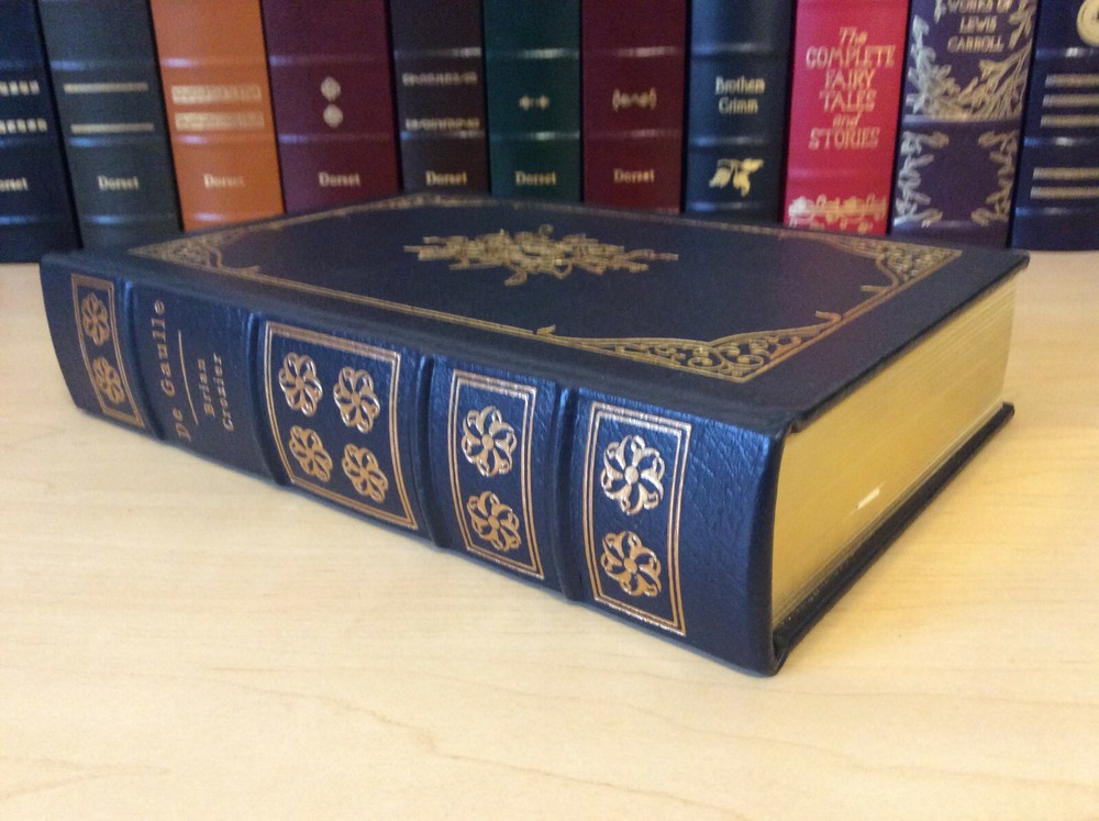 De Gaulle by Brian Crozier bound in leather, with gilt edged pages, gold accents, moiré endpapers, a ribbed spine, and a ribbon marker Item Condition: An Easton Press leatherbound in Very Good condition. There are no names, bookplates or stamps of previous owners inside. The binding is tight and the pages are clean. The gilt page edging is bright and shiny with some light wear and marks, and the leather is in nice condition with some rubbing to the corners. Dimensions are approx: 9.5" x 6.5" x 2" This book will ship in a box with bubble wrap. Photos are of the actual book that will be shipped.