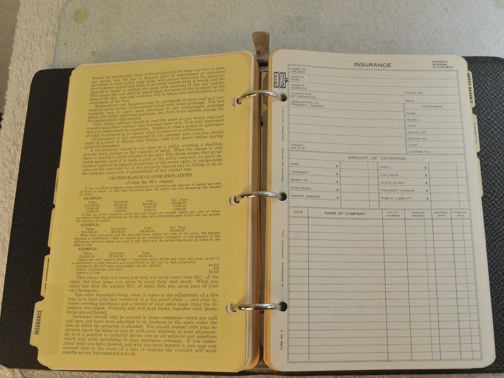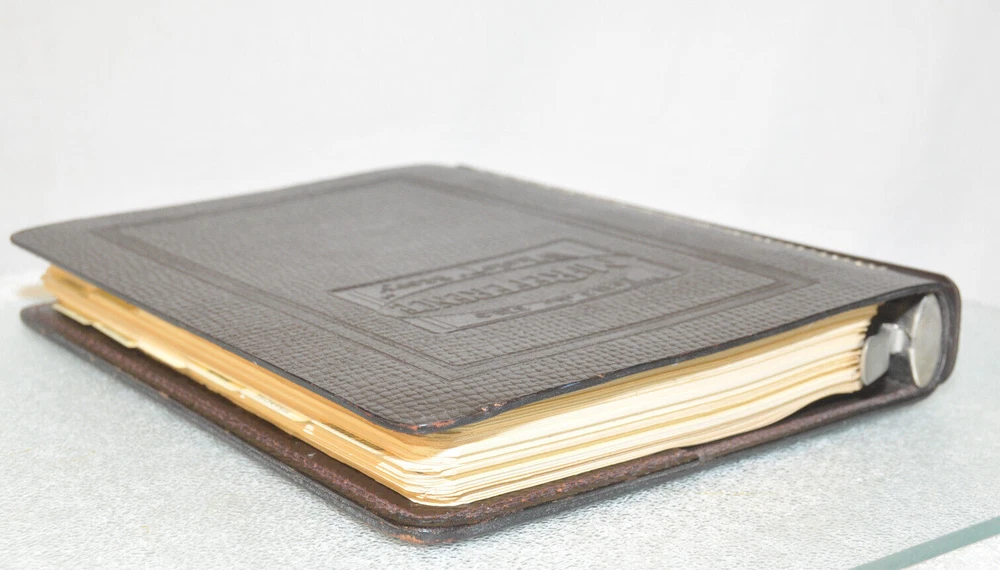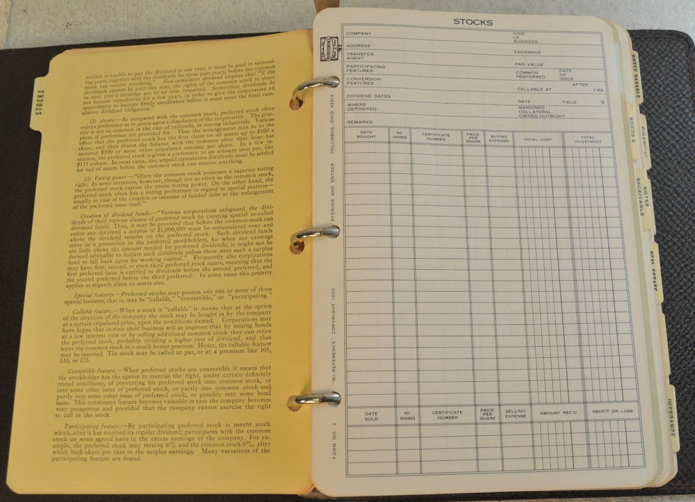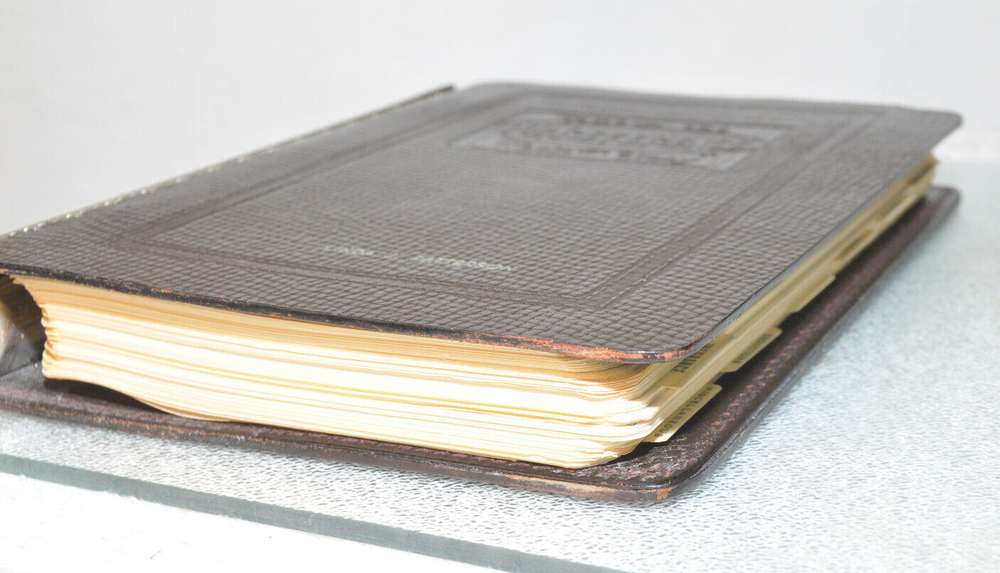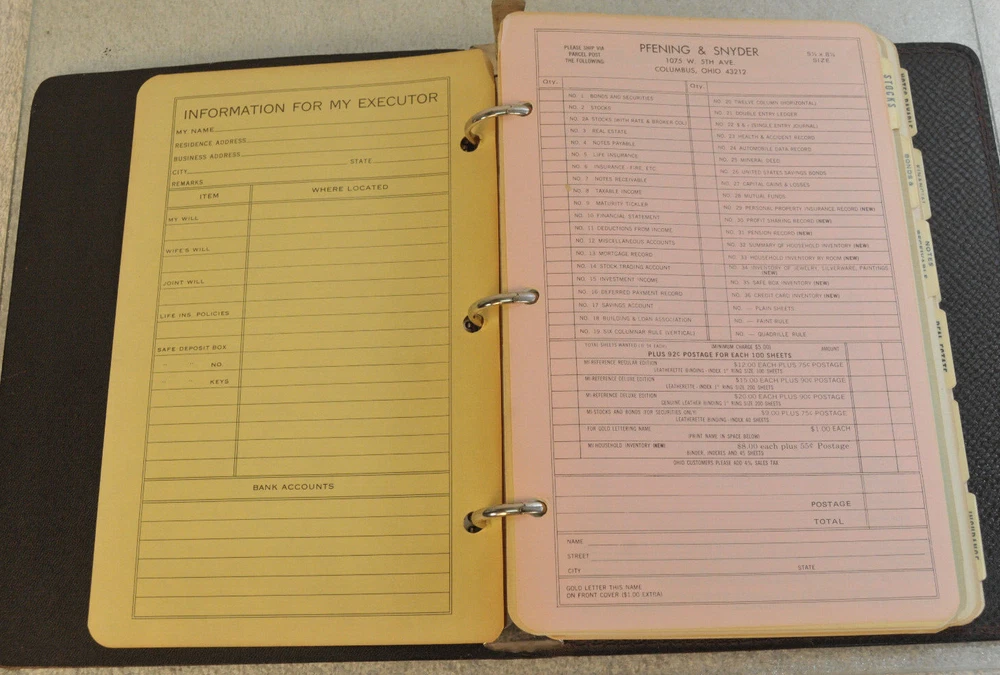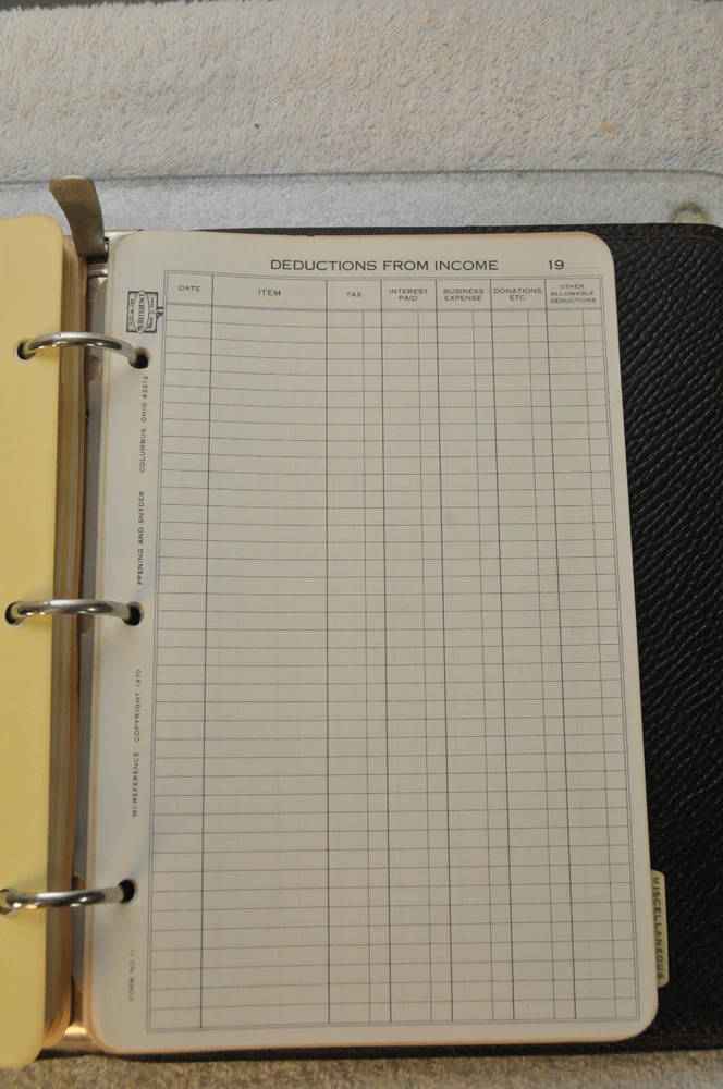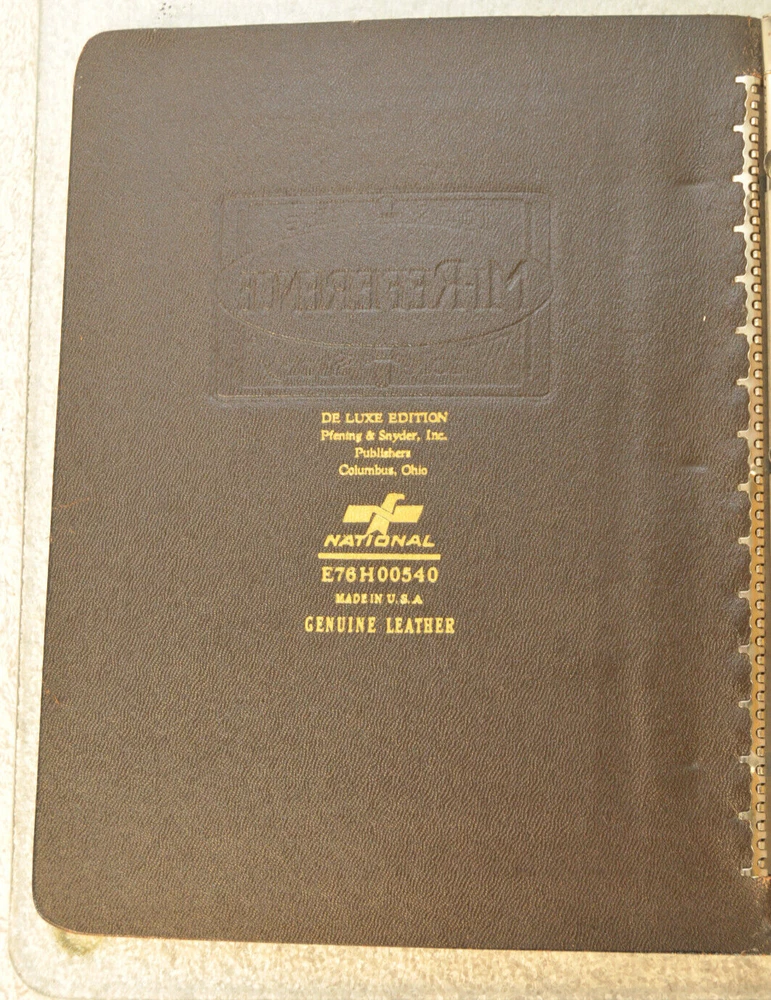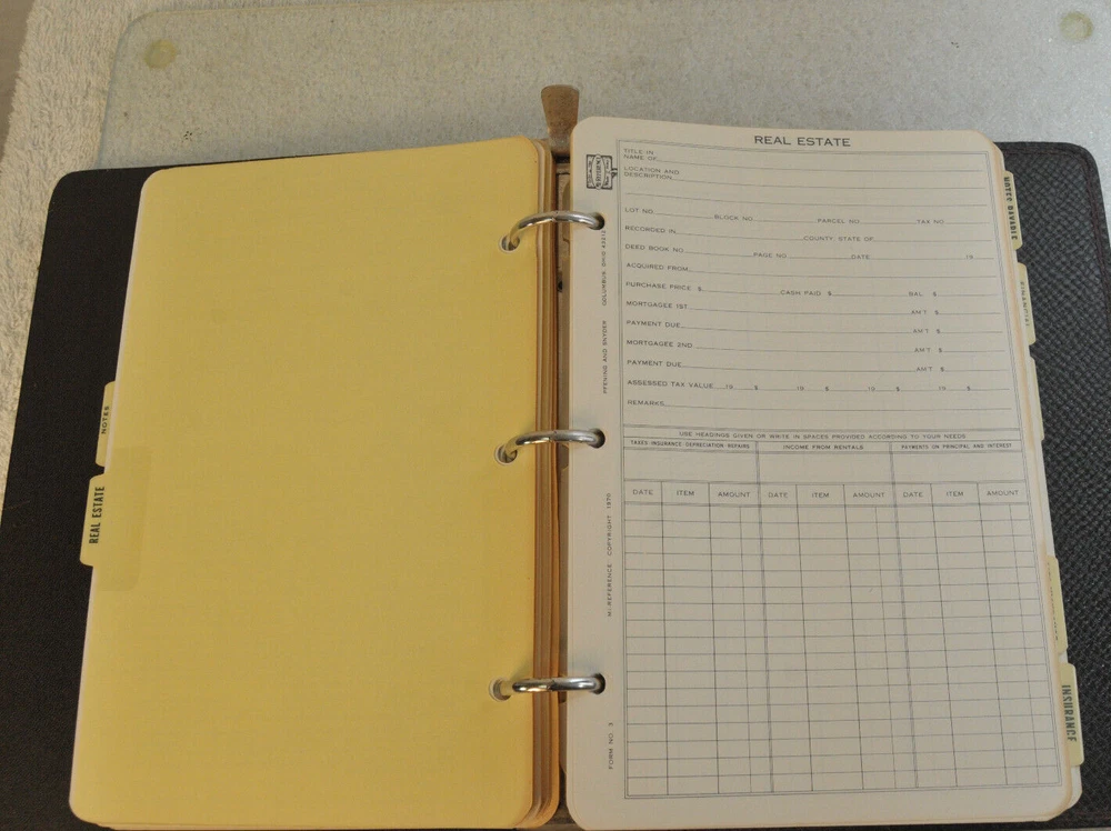 Vintage De Luxe Leather Mi-Reference Loose Leaf Personal Financial Reference Book 1977, As the cover succinctly states: "Tell the Whole Story" VINTAGE FINANCIAL ORGANIZER Mi-Reference by Pfening & Snyder Columbus Ohio Personal Financial Record Book Binder with assorted unused pages and tabs. Circa 1970s For 5 1/2" x 8 1/2" pages 3 ring binder Approximate Measurements: 7 x 9 x 1.5 Inch Binder Genuine Leather De Luxe Edition With Filler Inserts Which Have Not Been Marked Nor Completed. Do not get hacked or smacked with online records. Keep your records private and personal on paper. Rare Leather De Luxe 3-ring binder can be used for financial record keeping, for a private journal, a private notebook, project guide or even a planner. This genuine De Luxe leather Edition binder is rare and hard to find. Created in 1977 this binder is now 48 years old and going strong. Very good original condition. Original owners name was imprinted on the front cover. Comes with insert pages shown. Please see all photos for details and condition.