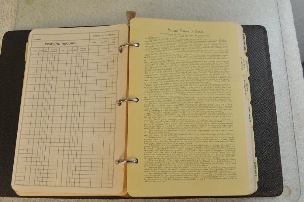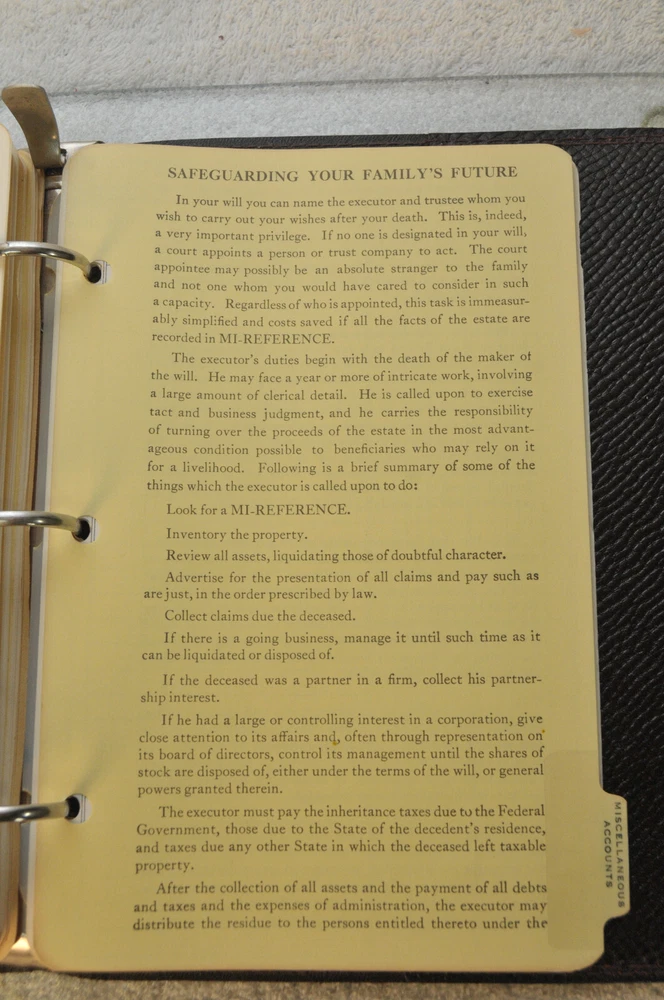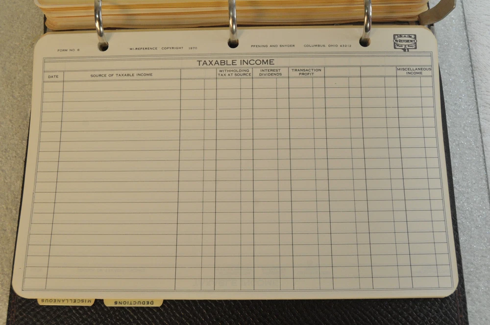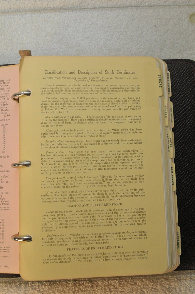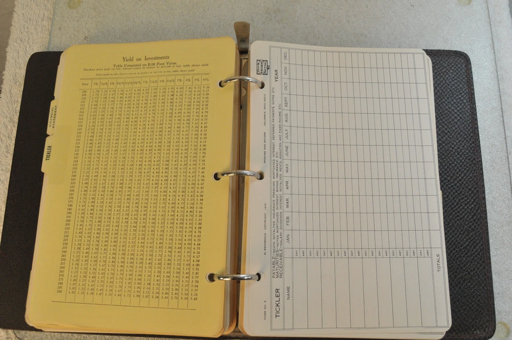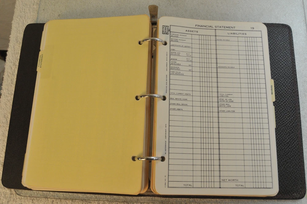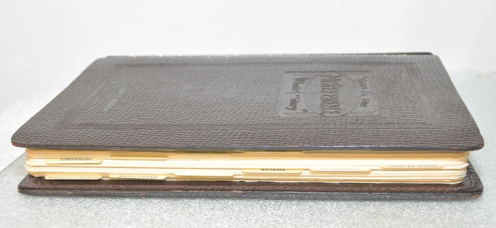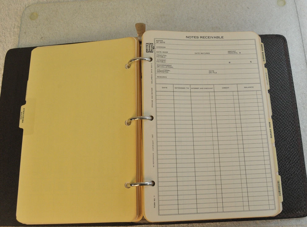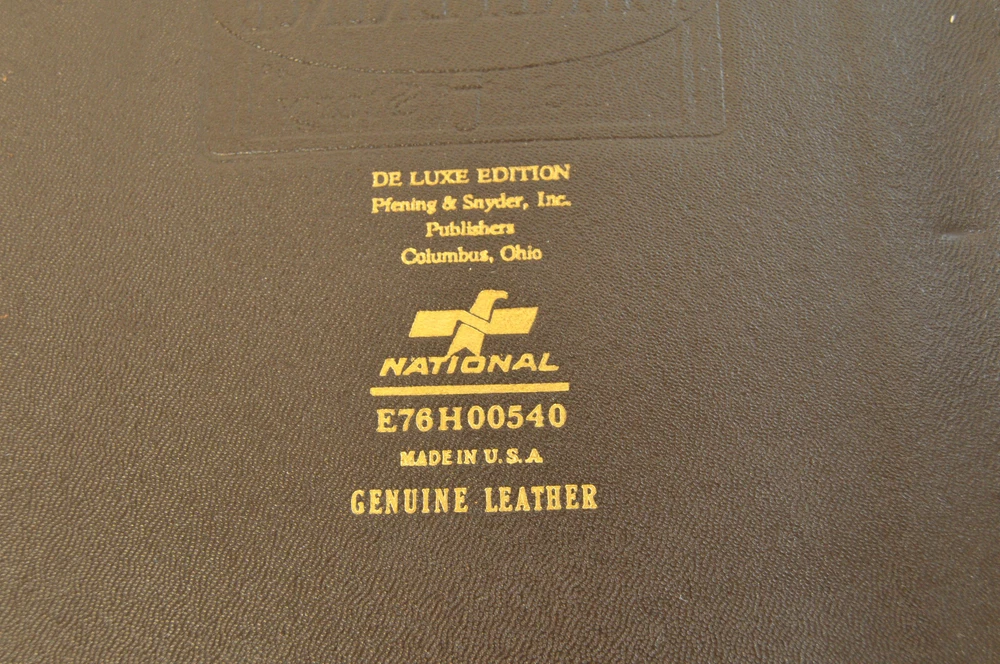 Vintage De Luxe Leather Mi-Reference Loose Leaf Personal Financial Reference Book 1977, As the cover succinctly states: "Tell the Whole Story" VINTAGE FINANCIAL ORGANIZER Mi-Reference by Pfening & Snyder Columbus Ohio Personal Financial Record Book Binder with assorted unused pages and tabs. Circa 1970s For 5 1/2" x 8 1/2" pages 3 ring binder Approximate Measurements: 7 x 9 x 1.5 Inch Binder Genuine Leather De Luxe Edition With Filler Inserts Which Have Not Been Marked Nor Completed. Do not get hacked or smacked with online records. Keep your records private and personal on paper. Rare Leather De Luxe 3-ring binder can be used for financial record keeping, for a private journal, a private notebook, project guide or even a planner. This genuine De Luxe leather Edition binder is rare and hard to find. Created in 1977 this binder is now 48 years old and going strong. Very good original condition. Original owners name was imprinted on the front cover. Comes with insert pages shown. Please see all photos for details and condition.