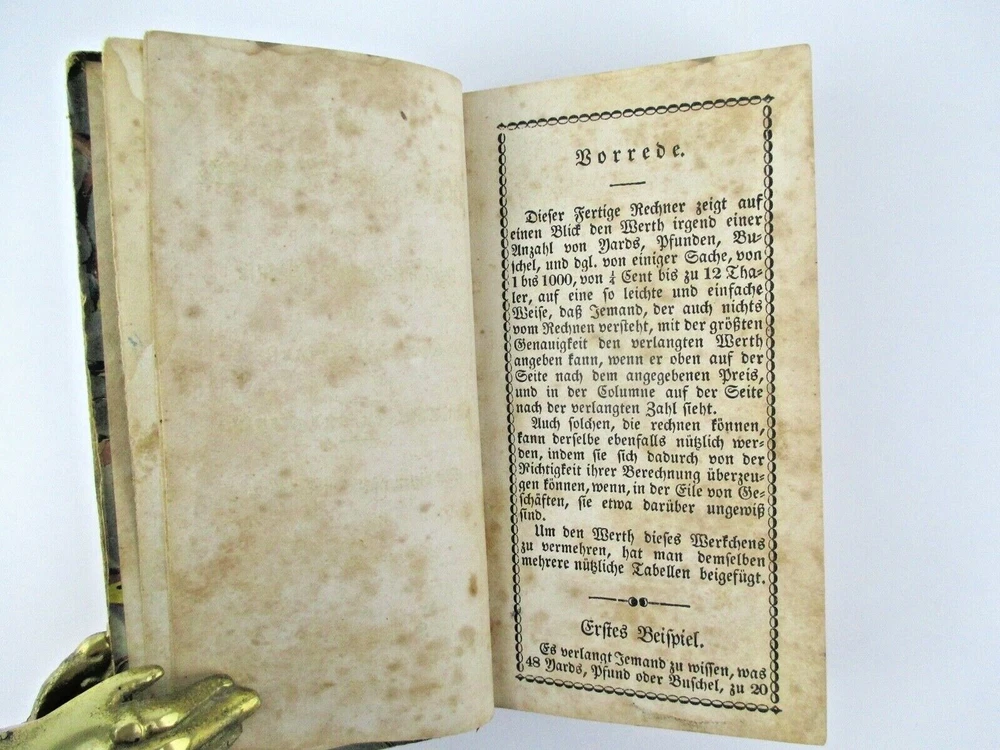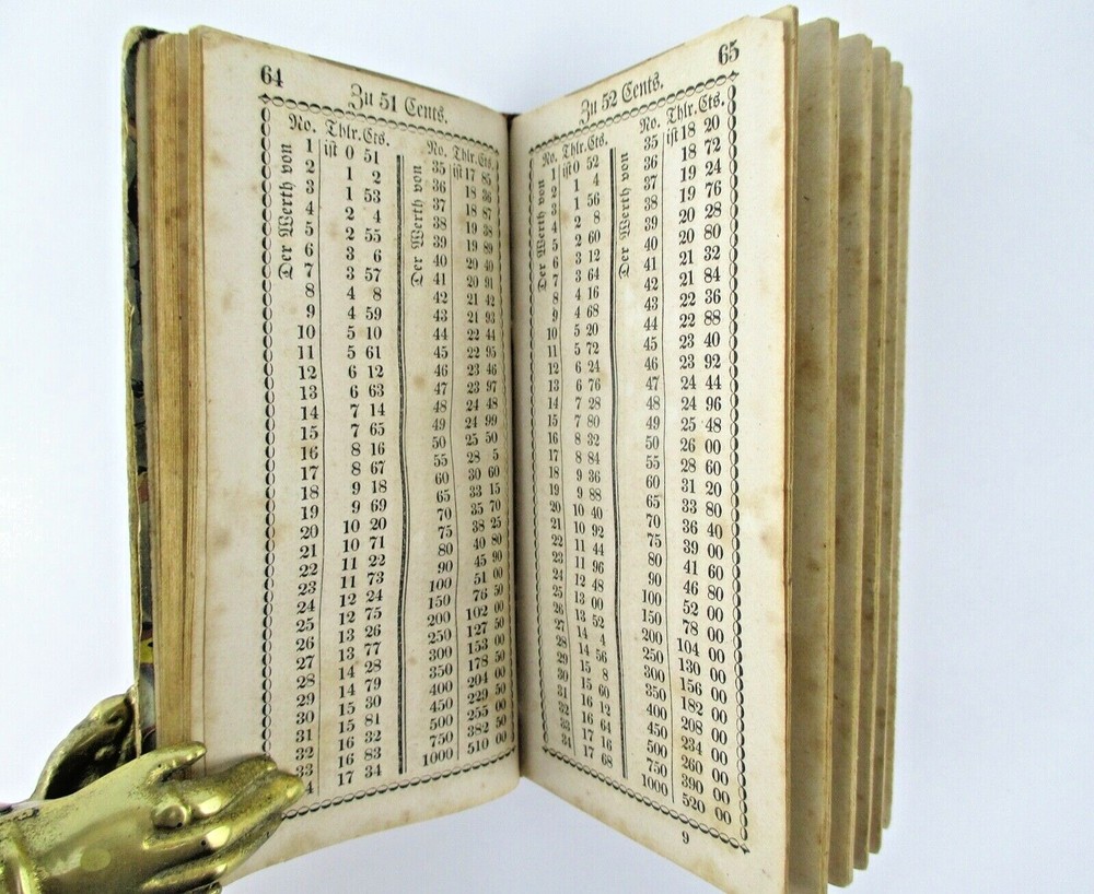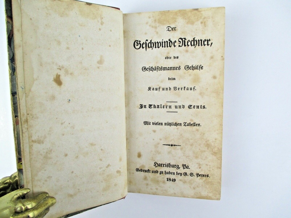 Der Geschwinde Rechner, Oder Des Geschäftsmannes Schulsse Beim Kauf Und Berfauf Ver in Thalern Und Cents Mit Vielen Nusslichen Tabellen . Harrisburg, PA: ... Peters, 1849. 144 pages. [Pardon any mistakes in my German transcription, please.] This slim volume (5 1/2" by 3") was a set of tables that served as a financial calculator for farmers and businessmen in the Pennsylvania German community of Western Pennsylvania in the 1840s. It's in its original binding of quarter leather and marbled boards. There's a former owner's name (Cornelius Moser) in ink on front flyleaf. Book is solid, but has edge wear and some foxing throughout.