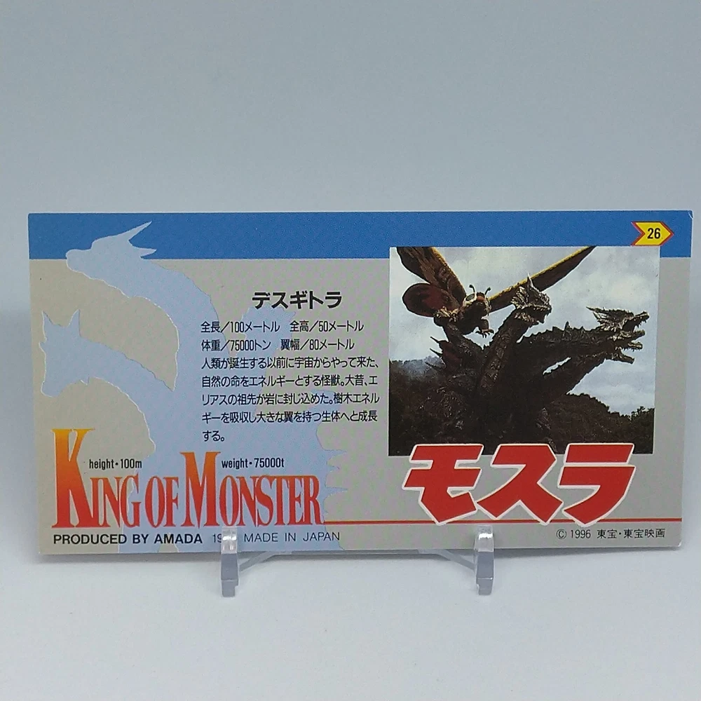 Desghidorah King of Monster Amada Wide Collection Trading Card No.26 1996 Description Please see the picture for the details of damages and dirt or ask us before your purchase. 100% Authentic or Money Back Guaranteed. (Do not worry you are protected by eBay and eBay Managed Payments) See the pictures for more details. If you have any question about the condition, accessories, or anything about the product, please feel free to message us. We are glad to answer all your concerns. Payment Same as ebay payment method. Shipping Economy shipping: Delivery time will be about 11 - 23 days. Standard shipping: Delivery time will be about 5 - 10 days. Expedited shipping: Delivery time will be about 1 - 4 days. Terms of Sale Money back guarantee within 30 days if returned by customer. We would not be able to accept your bid if you; 1) Don't have a PayPal account. 2) Have unpaid items reported. 3) Have a primary shipping address in countries you don't ship to. 4) Have reportedly violated eBay policies. 5) Have a Feedback score lower than the number you specify. International Buyers - Please Note: Import duties, taxes and charges are not included in the item price or shipping charges. These charges are the buyer's responsibility. Please check with your country's customs office to determine what these additional costs will be prior to bidding/buying. These charges are normally collected by the delivering freight (shipping) company or when you pick the item up - do not confuse them for additional shipping charges.