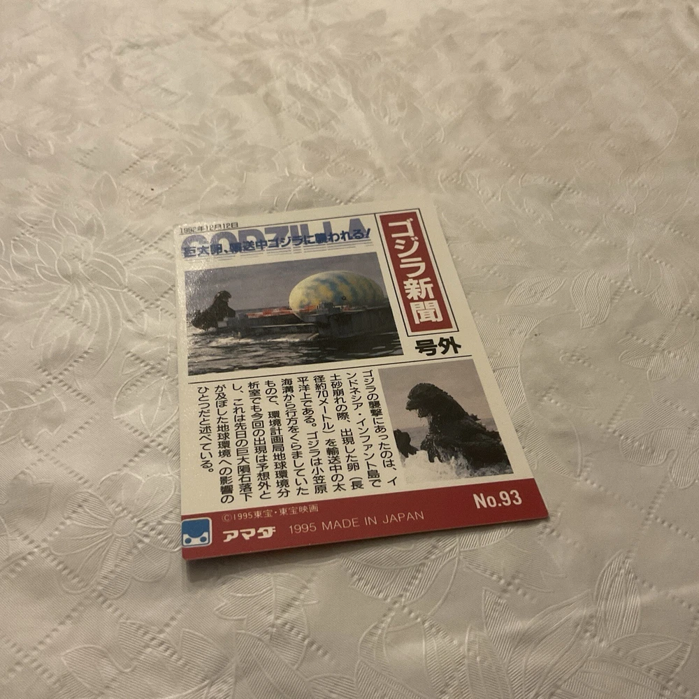 This is a very rare Japanese trading card featuring Destroroyah, one of the iconic characters from the Godzilla franchise. The card was manufactured by GODZILLA in 1995 and is part of the Non-Sport Trading Card category. It is a vintage item and comes in Japanese language with a card size of Japanese standard. The card is ungraded but in good condition. The unique collectible is a must-have for any Godzilla fan and will make an excellent addition to your collection. The card is numbered #93 and is a single trading card. It is not a custom bundle and was manufactured in Japan. Get your hands on this rare piece of history before it's too late!