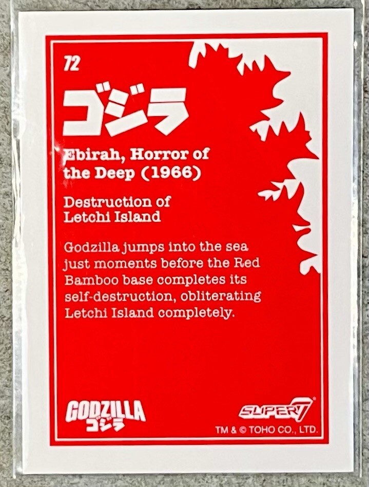 This rare and highly sought-after Destruction of Letchi Island 2024 SUPER 7 GODZILLA Toho Showa Series 1 #72 trading card is a must-have for any serious Godzilla collector. Featuring the iconic character Godzilla in a non-sport trading card format, this card is sure to impress. With a card number of 72 and part of the Series 1 set, this trading card is a true gem. The movie Ebirah, Horror of the Depp (1966) is depicted on the card, making it a perfect addition to any collection. Don't miss out on the chance to own this fantastic piece of Godzilla memorabilia.