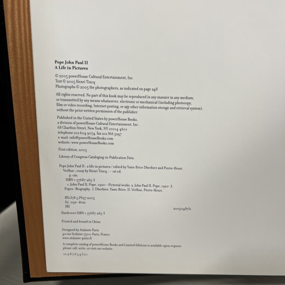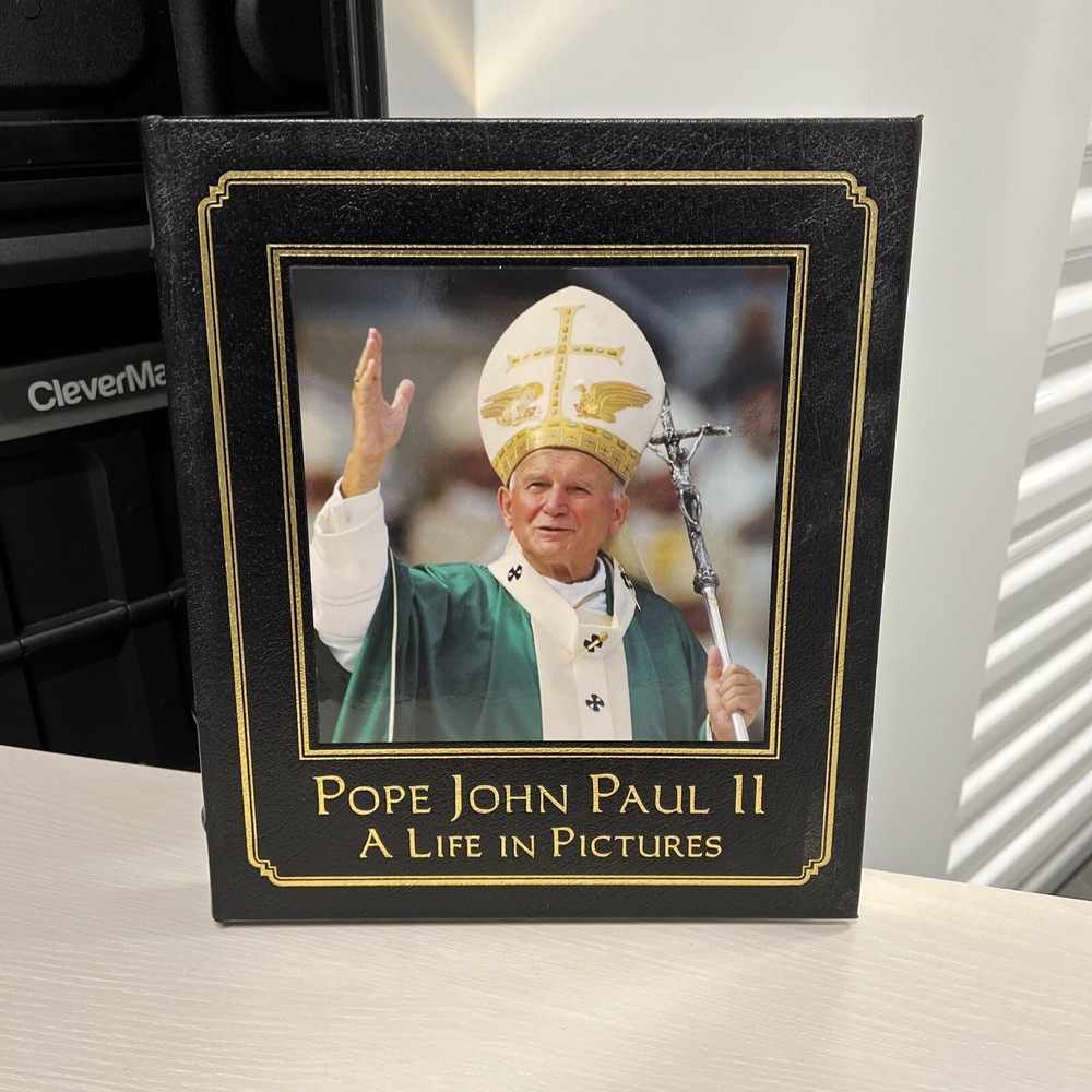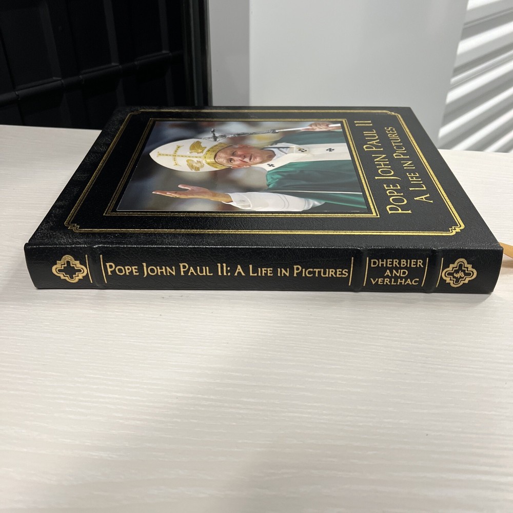 Dherbier, Verlhac POPE JOHN PAUL II: A LIFE IN PICTURES Easton Press 2005. Very good condition overall. Cover and gloss photo have some visible surface scuffs. Golden fore edges have some nicks and scratches. Measures 12x10x1”
