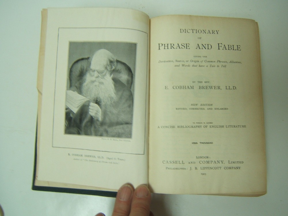 Dictionary of Phrase and Fable E Cobham Brewer New Edition 1905 1/4 Leather Dictionary of Phrase and Fable E Cobham Brewer New Edition 1905 1/4 Leather Click images to enlarge Description Dictionary of Phrase and Fable E Cobham Brewer, author New Edition 1905, London: Cassell and Company, Philadelphia, J. B. Lippincott Co. 1/4 Leather binding with gilt lettering. Good condition, clean pages. Strong binding. Wear to spine. Storeroom, Case D, Shelf 4 Payment Paypal Shipping Domestic shipping: Fixed Shipping Charges. International shipping: Weight based Shipping Charges. International Carriers are: Usps Priority Intl Shipping Carrier Domestic International Shipping Locations Usps Book Rate $0.00 - - I will ship to: United States, Worldwide Weight: 3 lbs. 8 oz. Shipping and Handling: Please check eBay's Shipping & Payment tab Thank you for visiting the Juniata General Store. We are located in the heart of Central Pennsylvania just up the road from the beautiful Juniata River. We offer a wide variety of merchandise, both new and vintage. Most of our inventory is one of a kind items and we add new items constantly so check back often. Vendio Images: More than just a pretty image. 250+ Mobile Responsive & Active Content Free Listing Templates with Vendio Sales Manager. Vendio provides powerful selling automation for sellers of all sizes. Get business information that counts! - Vendio Counters are active content free.