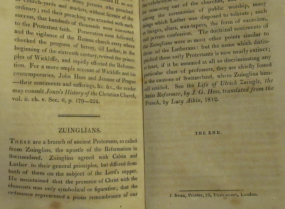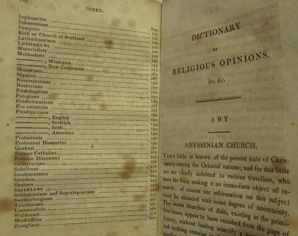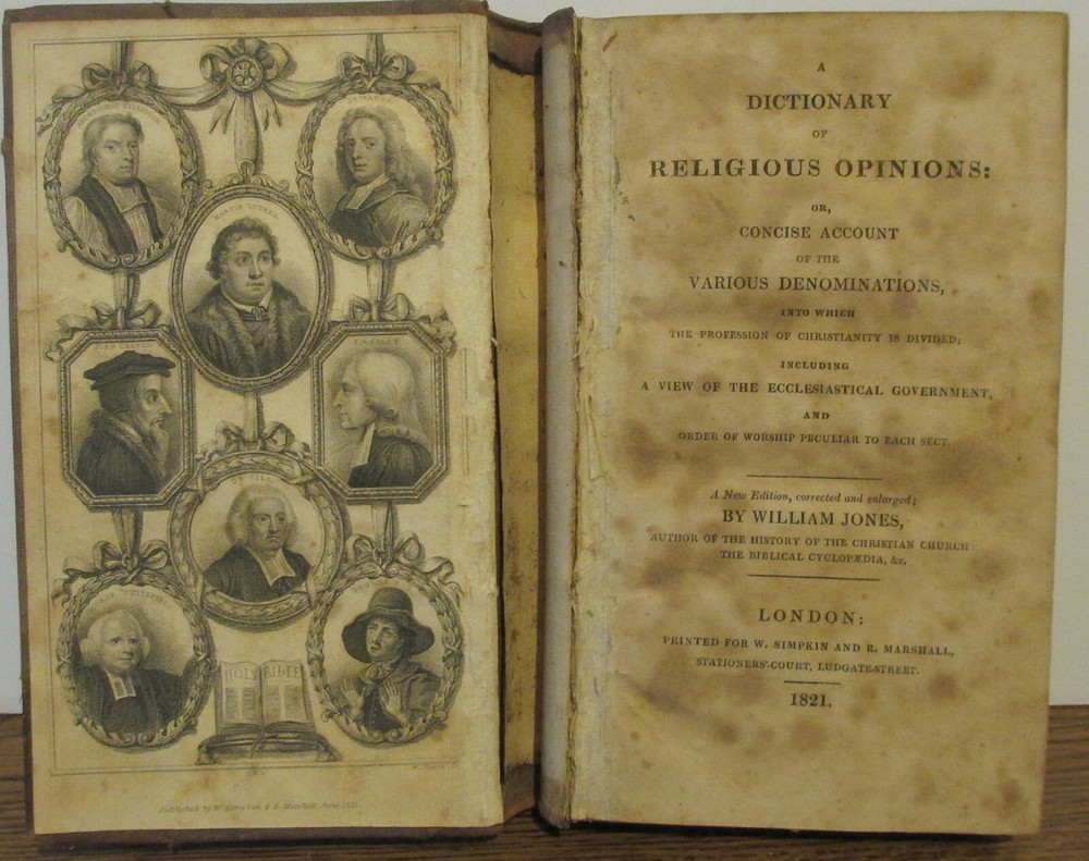 Dictionary of Religious Opinions or, Concise Account Of The Various Denominations Into Which The Profession Of Christianity Is Divided Including A View Of The Ecclesiastical Government And Order Of Worship peculiar To Each Sect A new edition, corrected and enlarged by William Jones, author of the history of the Christian church etc. Printed for W. Simpkin and R. Marshall Stationary Court, Ludgate Street London 279 pages. About 7 1/4 x 4 1/4 inches. Shipped insured and boxed by Priority Mail with signature required upon delivery.