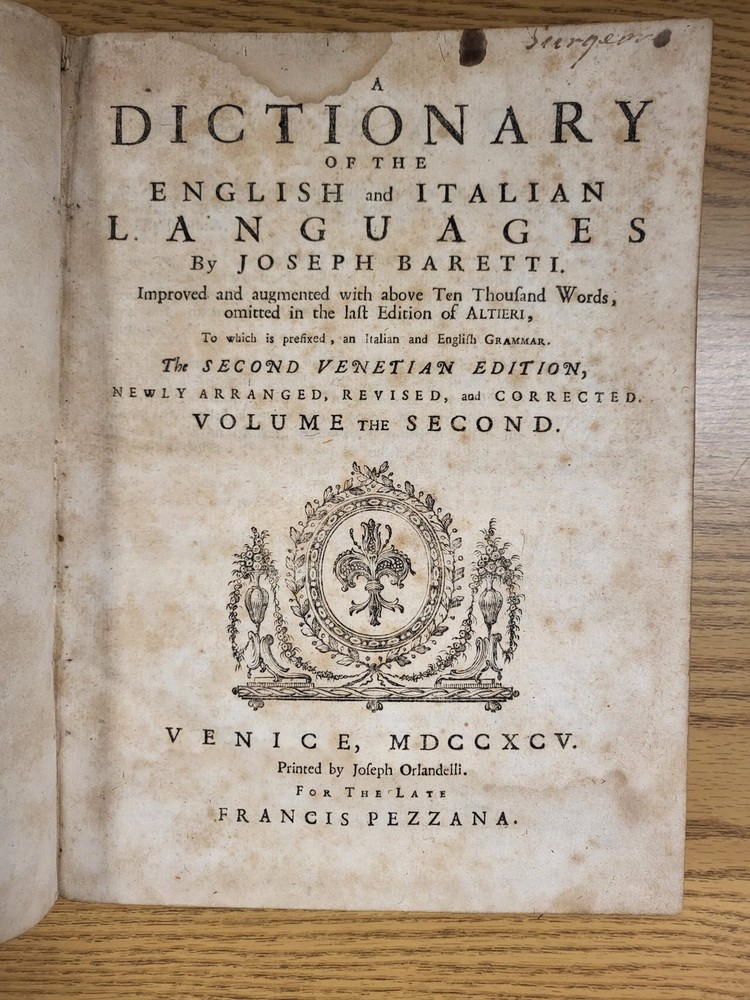 HGG Books presents ... Dictionary of the English and Italian Language volume 2 large leather volume 1795 Author: Joseph Baretti Publisher: Joseph Orlandelli Release Date: 1795 Seller Category: Reference Qty Available: 1 Condition: Collectible: Good Sku: barettidictionary Notes: A Dictionary of the English and Italian Languages by Joseph Baretti. Published by Joseph Orlandelli in 1795, the Second Venetian Edition. This is volume 2 which is organized by English words then translated to Italian (volume 1 is the opposite organized by Italian to translate to English).Water stain to top edge of first couple dozen pages, remaining pages clean, binding solid, hinges in tact with quality prior repair, curvature to heavy leather boards, minor staining to leather Don't forget to check out other great deals in our eBay Store!!