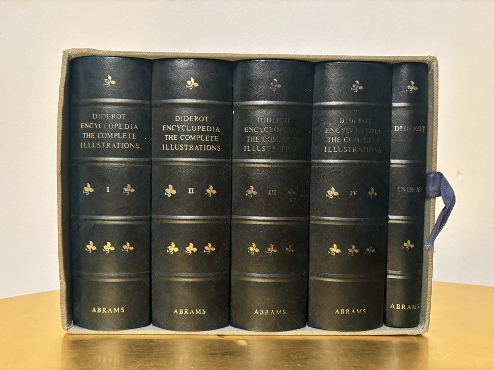 Denis Diderot. Diderot Encyclopedia: The Complete Illustrations, 1762-1777. Introduction by Roger Lewinter. Harry N. Abrams, Inc.: New York, 1978. First Thus. Five 12mo volumes ( 7" ) in cloth slipcase. Blue leather-backed cloth, titled in gilt on spines; pp. xli, 1-755; 756-1543; 1544-2323; 2324-3115 + 303 pp . ( Index). Fine, unmarked set in lightly worn but still Near Fine slipase. A beautifully produced, reduced-format facsimile, containing reproductions of all 3115 engraved plates in the original edition of the Encyclopédie (Paris: 1762-77). Introductory essay by Roger Lewinter. Excellent Condition, books are unmarked, fresh, with no damage or flaws inside or out, as if new; the slipcase shows some light soiling, commensurate with age.