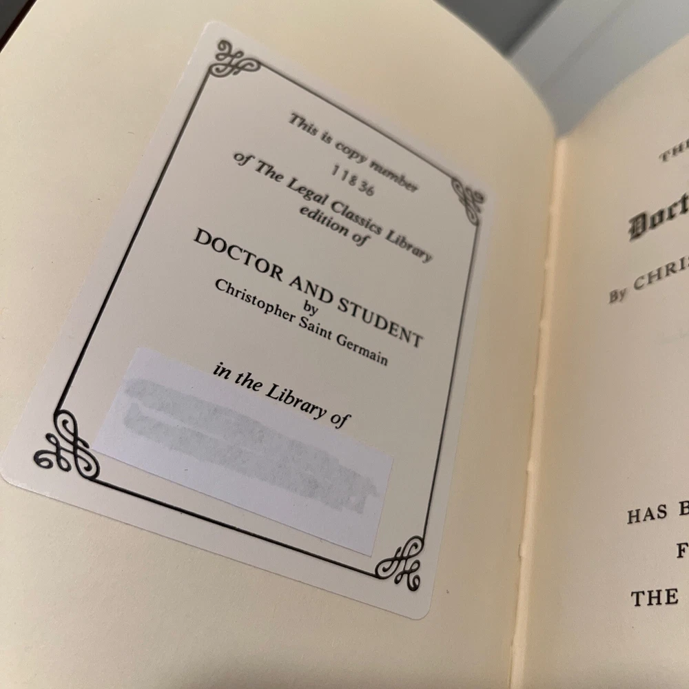 Doctor and Student Christopher Germain Leather Legal Classics Library Gryphon. This is not a new book but it is in very good condition. There is some shelf where on the front cover that I have highlighted in the photos. There is also a book plate inside the book. I have cover the name of the original owner.