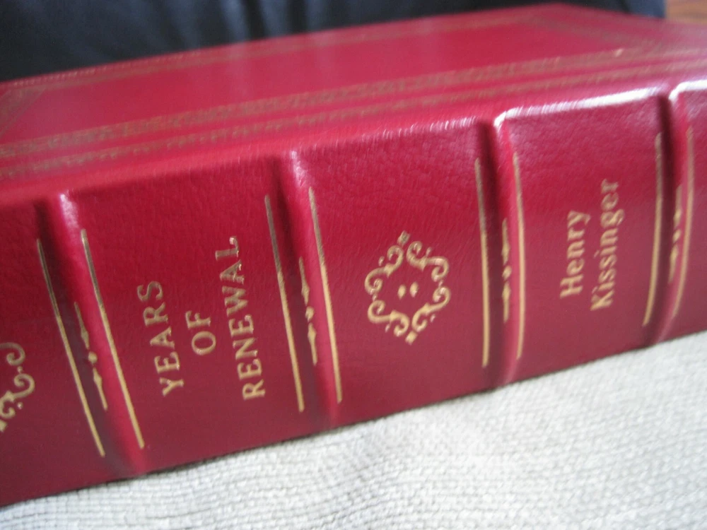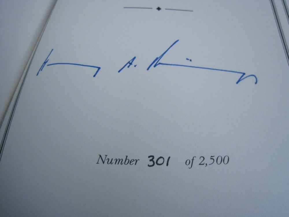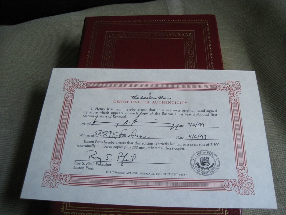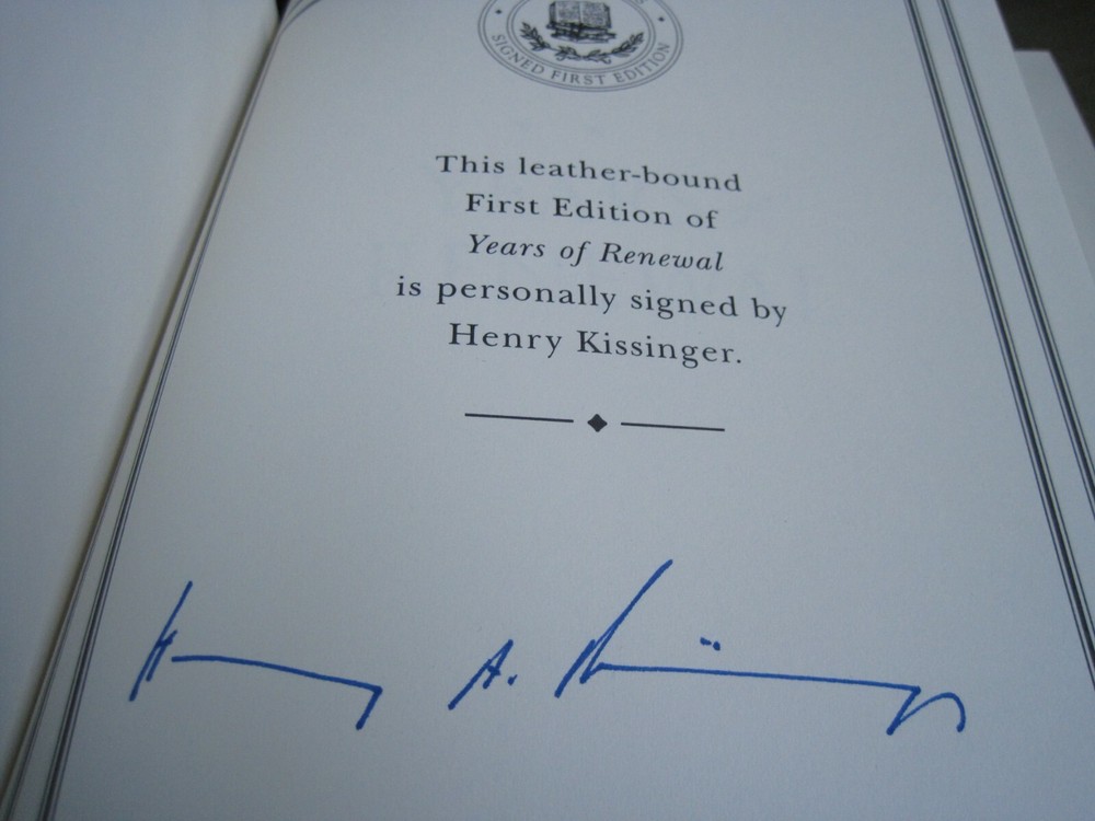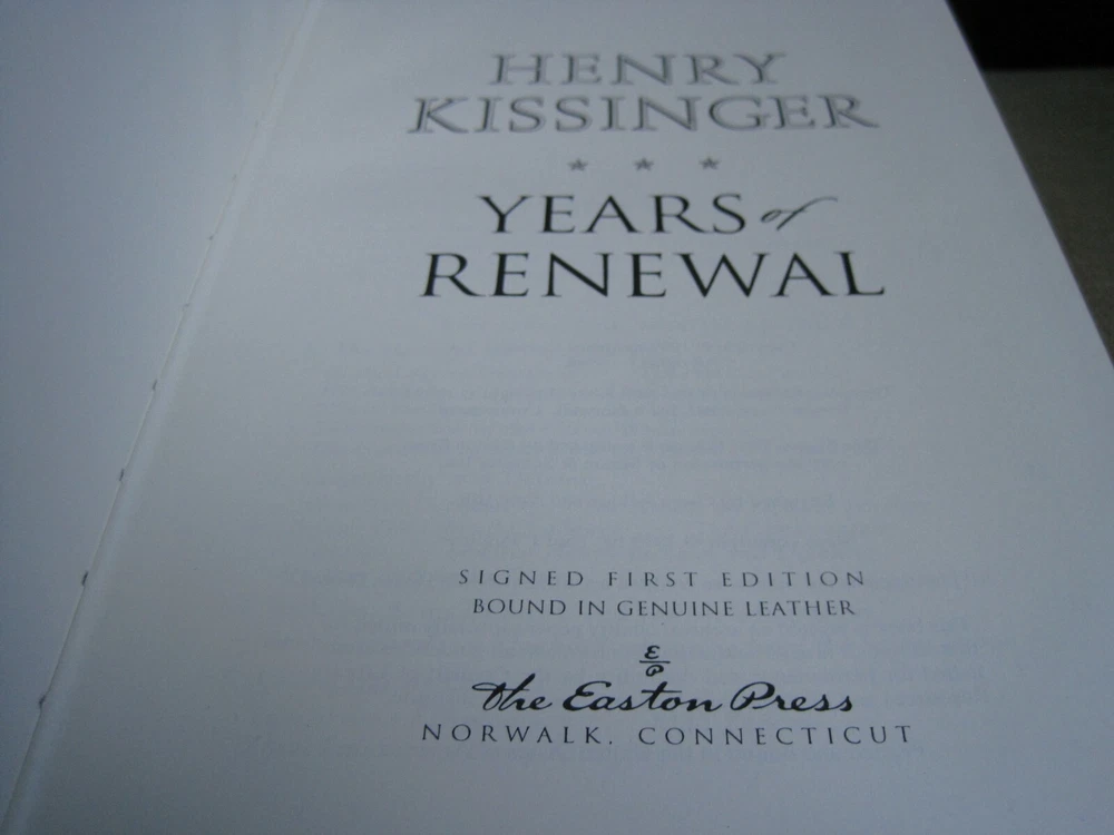 This is a leather bound signed and numbered first edition of Secretary of State Henry Kissinger's best-selling memoir - "Years Of Renewal" . The book is in unread condition and with no signs of previous ownership. There are some scratches of the gold gild on the side of the pages (see pictures). Signed by the former Secretary of State and Nobel Prize winner on the limitation page, this is number 301 of only 2500 numbered copies ever printed. The book has the signed and dated certificate of authenticity included. Perhaps the best-known American diplomatist of the twentieth century, Henry Kissinger is a major figure in world history, winner of the Nobel Peace Prize, and arguably one of the most brilliant minds ever placed at the service of American foreign policy, as well as one of the shrewdest, best-informed, and most articulate men ever to occupy a position of power in Washington. The eagerly awaited third and final volume of his memoirs completes a major work of contemporary history. It is at once an important historical document and a brilliantly told narrative of almost Shakespearean intensity, full of startling insights, unusual (and often unsparing) candor, and a sweeping sense of history. Years of Renewal is the triumphant conclusion of a major achievement and a book that will stand the test of time as a historical document of the first rank. Easton Press Full Genuine Leather Hubbed Spine Accented Wit 22 kt. Real Gold Satin Ribbon Page Marker Distinctive Cover Design Gilded Page Edges To Protect Against Humidity High Quality Acid - Free paper Smyth-Sewn Pages Silk-Moire Endleaves I combine multiple items for savings on shipping charges. I ship worldwide. Please ask about international shipping charges and/or different shipping options. Thank you!