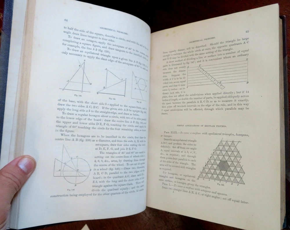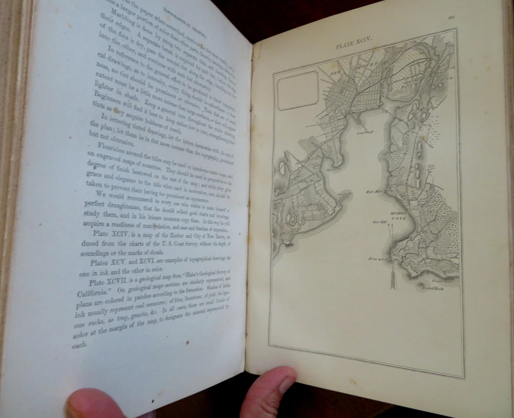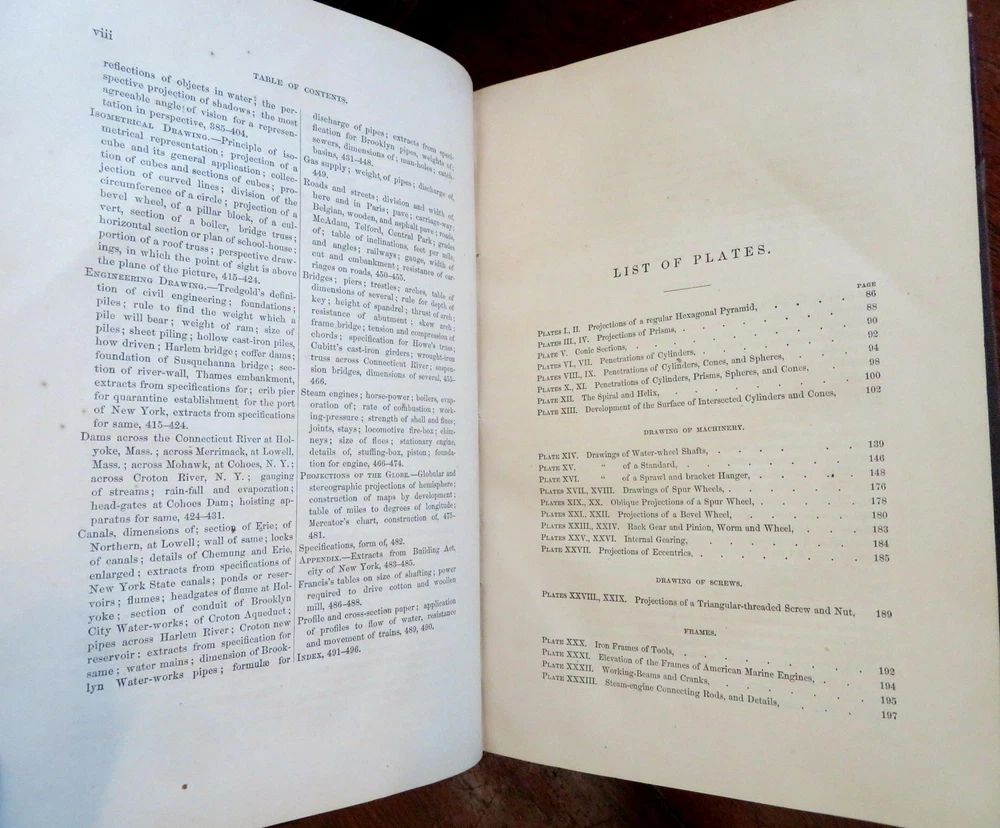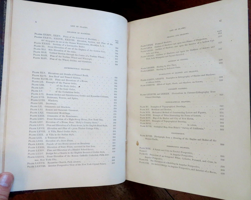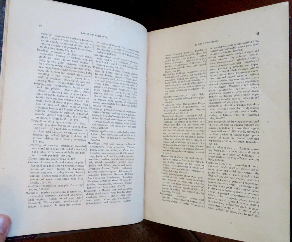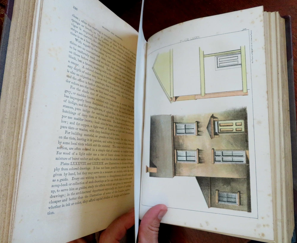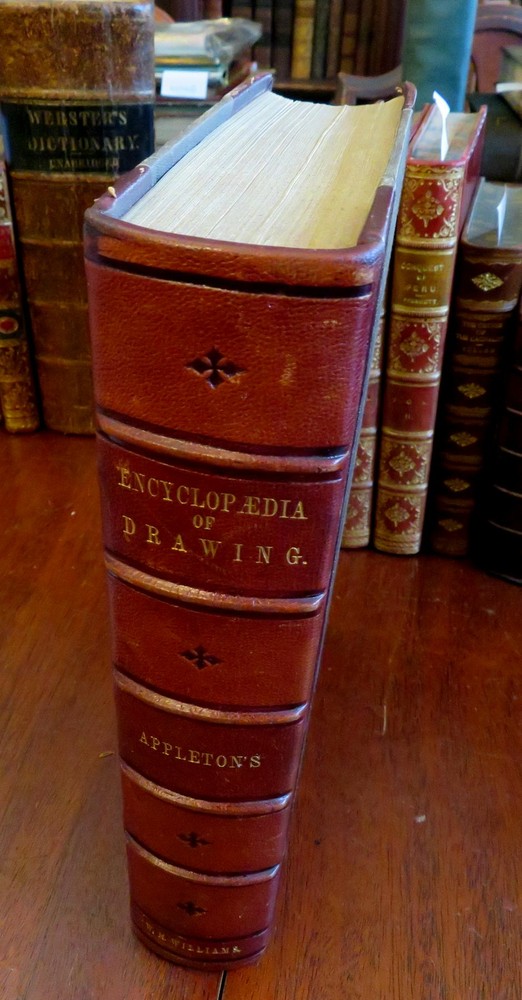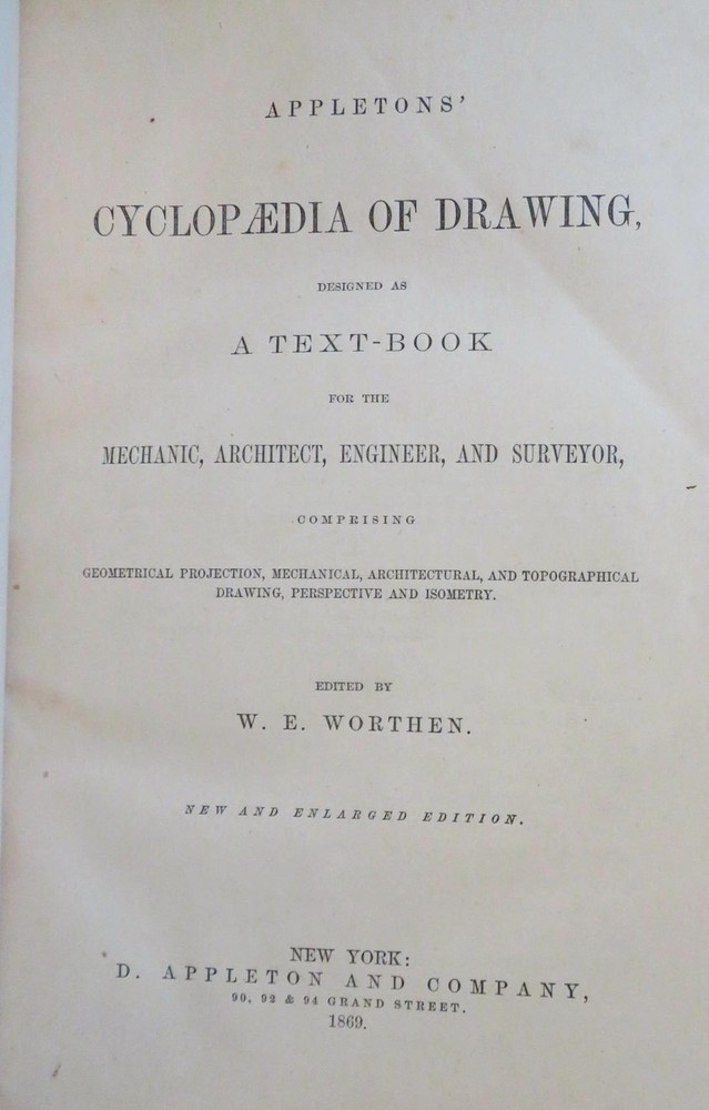 Drawing Encyclopedia Mechanics Architecture Topography 1869 Appleton leather Drawing Encyclopedia Mechanics Architecture Topography 1869 Appleton leather (Old Books, 19th Century Books, Leather Books, Mechanical Engineering, Architectural Drafting, Surveying, Topographical Projection, Geometry, Illustrated Books). Appleton's Cyclopaedia of Drawing, Designed as a Text-Book for the Mechanic, Architect, Engineer, and Surveyor. Comprising Geometrical Projection, Mechanical, Architectural, and Topographical Drawing, Perspective, and Isometry, edited by W. E. Worthen. Published 1869, New York by D. Appleton and Company. 496 pages. Text in English. Profusely illustrated throughout, including a mounted real photographic plate, three color lithographed plates, a hand colored map of California and countless illustrations, many full page, some lithographed. A superior example of this monumental book. Attractive antiquarian 1/2 leather binding, raised bands, gilt title lettering, embossed compartment decorations, cloth covers. Book is physically old and shows some signs of handling and time. Binding gently age worn but still appealing, leather and joints slightly rubbed but still supple, remains overall very attractive as an object. Text block paper is gently age toned as typical, internally book remains mostly clean, tight and sound. A book which has been taken care of but may/ does not look like new. Still attractive on the shelf. Book displays a pleasing and unique age patina and is in rather nice antiquarian condition, any age flaws seem easy to overlook or forgive. Please review photos for more detailed attempt to present this book as it survives. We often over-describe any flaws that many sellers would not even bother to mention since most people would overlook them as minor and unworthy of comment. Many people tell us the books they receive from us are nicer in person than they appears on the screen. We want you to be clear about what you are buying, so we take numerous photos and try to describe it openly and honestly. Book Measures c.10 1/2" H x 7 1/4" W. [B10173].