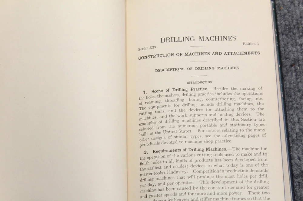 Drilling Machines And Practice by I.C.S. Staff Leather Bound 1936 Edition #176 Good condition. The cover edges exhibit light shelf-wear. The text pages are clean with no writing, marks, stains, etc. Please see the included photos for close-up condition of the item. All images are photos or scans of the exact item you will receive. No stock or re-used photos . Please review images and condition notes, and feel free to ask any questions you may have. The item will be securely packaged to assure safe arrival. I am always happy to combine shipping whenever possible. Thank you for your interest!