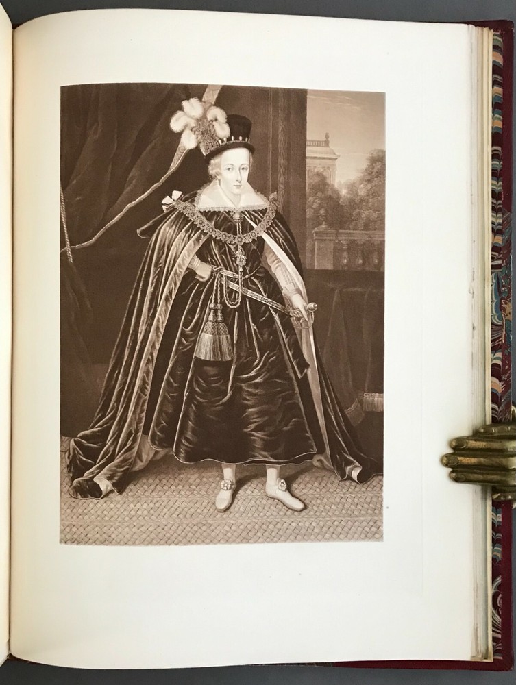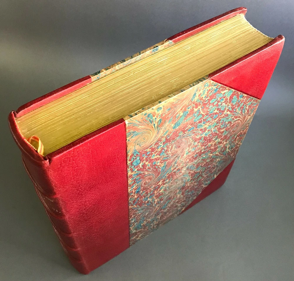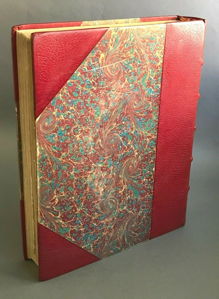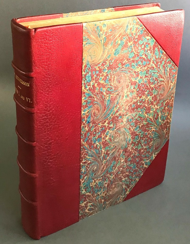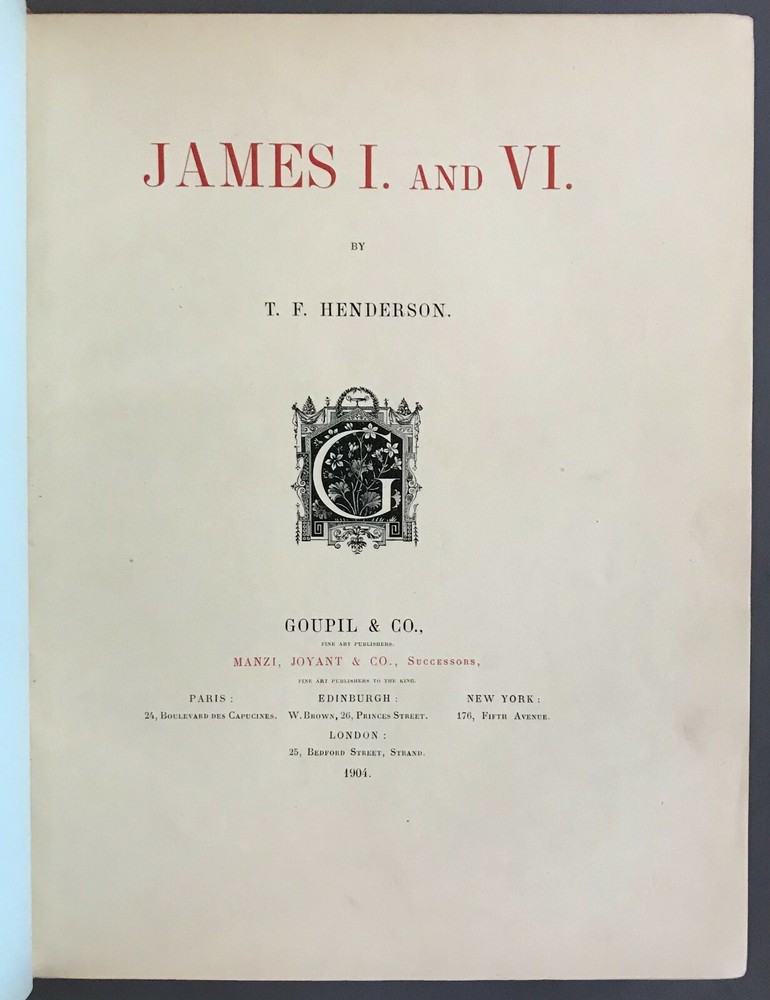 [Durvand Binding] Limited Edition Henderson James I and VI Goupil 1904 T. F. Henderson. James I. and VI. Paris: Goupil & Cie, 1904. Limited edition, No. 192 of 800 numbered copies on fine paper. Royal quarto. 306pp. Illustrated, with engraved plates printed by Manzi, Joyant & Co. Beautifully rebound in red three-quarter levant morocco over marbled paper boards by Durvand of France. Stamped in gilt to spine, five raised bands, top edge gilt, marbled endleaves, silk ribbon page marker. Extremities gently rubbed and edgeworn; front hinge cracked; occasional light toning. nameplate to verso of first blank, clipped dealer’s description affixed to front pastedown. Very good. RJL-00433A Visit our eBay store for more beautiful books in fine bindings! https://www.ebay.com/str/inkqnabula/Fine-Bindings/_i.html?_storecat=31734272014