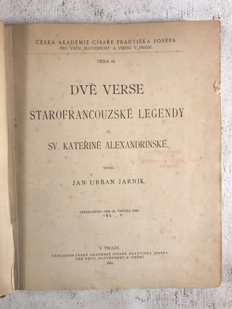 Dve Verse Starofrancouzske Legendy Sv. Katerine Legendy Slovak Language (Two Verses of the Old French Legend of St. Catherine of Alexandria) ( 355-C) Condition: Wear to extremities else good condition. Some ex-library markings. Binding is tight and sound. See photos for complete description and condition. Publisher: Publication Date: 1894 Physical: 1 vol Size (inches): 10 1/2 x 8 3/4 Binding: Brown 1/2 leather with marble boards and marbled end sheets. Language: English I ship next business day. Satisfaction guaranteed. Check out more books and stuff here at my Ebay store: https://www.ebay.com/str/ingeneral?_trksid=p2047675.l2563 Thanks for looking