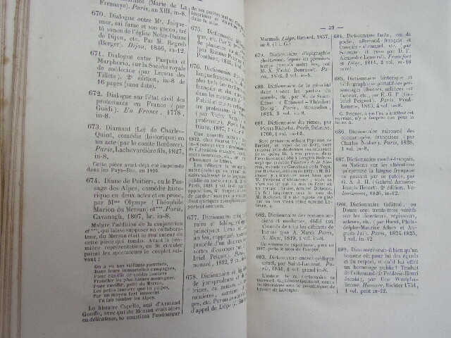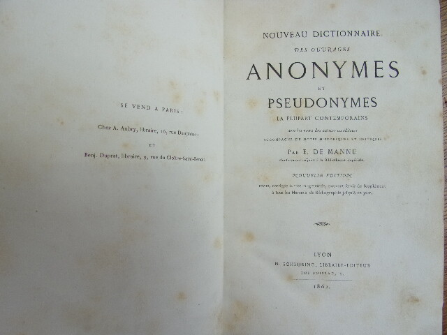 E. De Manne. Dictionary of Anonymous and Pseudonymous Works. 1862 (Rare) The description of this item has been automatically translated. If you have any questions, please feel free to contact us. New dictionary of anonymous and pseudonymous works, most contemporary. E. de Manne with the names of the authors or editors, accompanied by historical & critical notes. New edition, revised, corrected & expanded, which can serve as a supplement to all biography manuals to date. Rare edition , bringing together 3510 articles from books & authors. half leather bound flight, 230x140, good condition, 406pp. Table of contents + erratum. Lyon, N. Scheuring, Bookseller 1862 ref/210 New dictionary of anonymous and pseudonymous works, most contemporary. E. de Manne with the names of the authors or editors, accompanied by historical & critical notes. New edition, revised, corrected & expanded, which can serve as a supplement to all biography manuals to date. Rare edition, bringing together 3510 articles from books & authors. half leather bound flight, 230x140, good condition, 406pp. Table of contents + erratum. Lyon, N. Scheuring, Bookseller 1862 ref/210 Caractéristiques spéciales Édition originale Époque XIXème Reliure Cuir Langue Français Auteur E. de Manne Sujet Dictionnaires Date de publication 1862 Nom dictionnaire des ouvrages anonymes et pseudonymes,