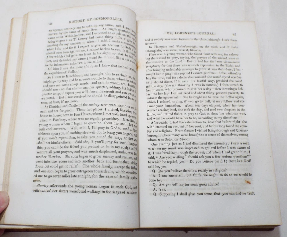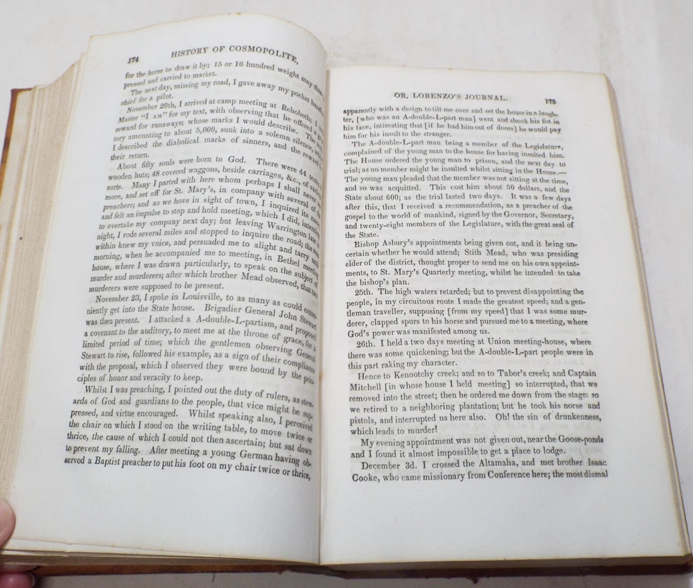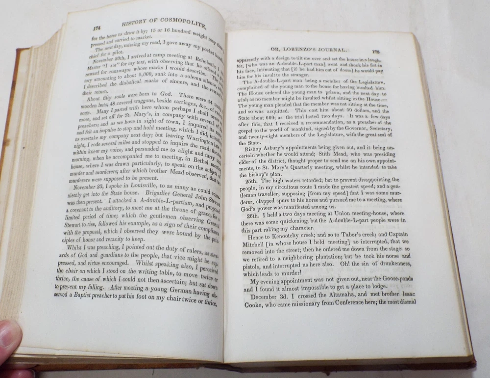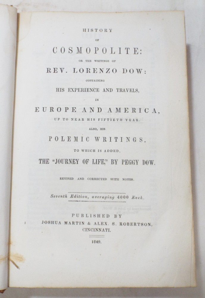 Title: Antique Book Description: Presented for your consideration is this interesting EARLY antique book. The book is titled, History of Cosmopolite: or the Writings of Rev. Lorenzo Dow. It was published by Joshua Martin & Alex S. Robertson in Cincinnati in 1849. This is the 7th edition of the book and was limited to 4,000 copies. The 720 page book tels of Lorenzo Dow and his experiences as he traveled throughout Europe and America. It also includes his poetic works as well as "The Journey of Life" by Peggy Dow. All pages appear to be intact. The book is completed with a leather cover. Binding is in very good condition. This early book would make a great addition to any rare or antique book collection! Would make a great read for anyone interested in history or religious history! Some light to mild page foxing. Cover has some wear from age and use. Some tearing is along the top edge of the spine. Overall in VERY GOOD condition for being over 150 years old! Please refer to the photos for the best details. Measures 8 3/4" long, 5 3/4" wide and 1 3/4" thick. Please take a look at our photos and feel free to message us with any questions. Shipping Information: Please see shipping calculator below. Buy multiple items and save on shipping! -ATTENTION INTERNATIONAL BUYERS- Import duties, taxes and charges are not included in the item price or shipping charges. These charges are the buyer’s responsibility. Please check with your country’s customs office to determine what these additional costs will be prior to bidding/buying.” “These charges are normally collected by the delivering freight (shipping) company or when you pick the item up – do not confuse them for additional shipping charges.” “We do not mark merchandise values below value or mark items as ‘gifts’ - US and International government regulations prohibit such behavior.” Please note that we try our hardest to assure accurate descriptions of the items we list. If you are unhappy with your purchase, please contact us so we can guarantee optimal satisfaction. Thank you and good luck! Please see our auction list for a selection of other quality antiques currently up for sale. This item is being offered by: The Hitching Post Antiques Mall Established in "1984" - We welcome all bidders (and non-bidders, alike) to review a potential purchase or to visit and browse through our 8,000 square feet of antiques. We are located 2 miles west of beautiful Tecumseh, Michigan, on M-50 near the intersection of M-52. Voted Michigan's Lenawee County's "Finest Antique Mall", and presenting over 40 quality dealers under one roof, our staff will be happy to assist you in making an informed, knowledgeable purchase. Our store operates seven days a week, 361 days a year, during the hours of 10:00 a.m. to 5:30 p.m. Best Wishes! -- Your Friends at the Hitching Post Antiques Mall Please check out my other items ! And be sure to add me to your favorites list !
