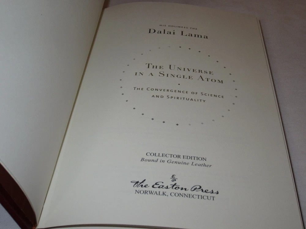 From the Easton Press Collection... The Art of Happiness The Universe in a Single Atom by The Dalai Lama Complete Two (2) Volume Matching Set Published by The Easton Press Bound in Premium Full Leather This set contains all of the classic Easton Press trimmings: Premium Leather Silk Moire Endleaves Distinctive Cover Design Hubbed Spine, Accented in Real 22KT Gold Satin Ribbon Page Marker Gilded Page Edges Long-lasting, High Quality Acid-neutral Paper Smyth-sewn Pages for Strength and Durability Beautiful Illustrations A very scarce set in any condition, this set is in Fine condition. The front in back covers are in terrific condition and the gilded page edges show hardly any wear (see pictures). There are no markings, bookplates or other signs of prior ownership. This set is published by Easton Press and would be a beautiful addition to your Easton Press collection. Overall, this is a grade collector's set. It is very elusive in this superior condition, as only a limited number of them were ever published, so now is the time to act. Hopefully you can add this set to your collection and enjoy it in the years to come... Please Email Me With Any Questions You Might Have! Shipping Info: Buyer to Pay Shipping and Handling International Bidders Pay Extra Shipping Seller Not Responsible For Uninsured Items Lost or Damaged in Mail Good luck and happy bidding!