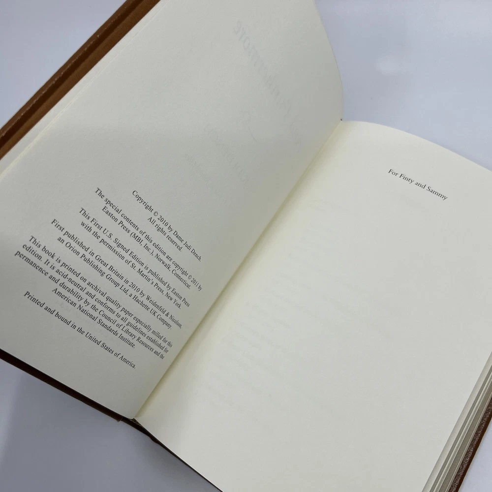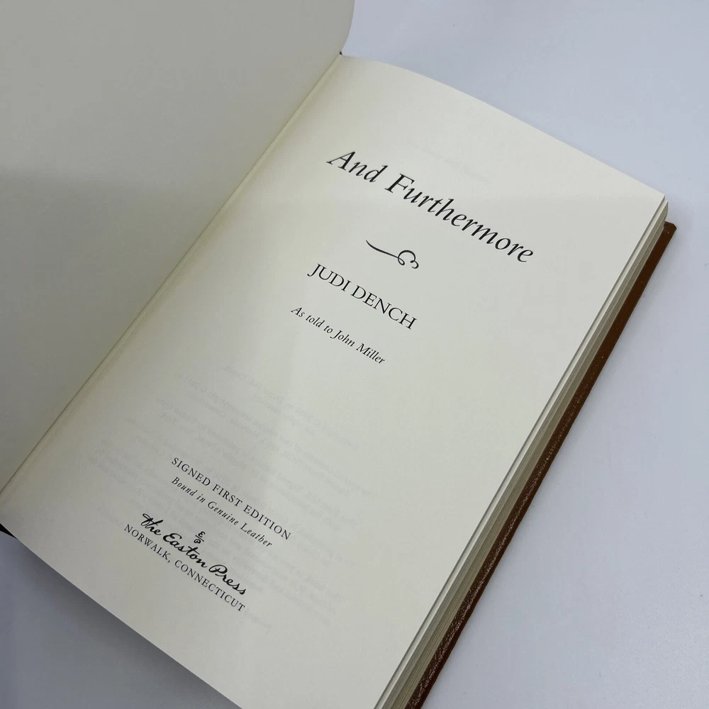 This stunning leather-bound Easton Press edition of *And Furthermore* is a must-have for collectors and Judi Dench fans alike! Personally signed by the legendary Dame herself, this rare first edition is beautifully crafted with elegant gilt details. Though showing slight shelf wear, the book remains in excellent condition, complete with its original Certificate of Authenticity. A true gem for any library—don’t miss the chance to own this exclusive piece of cinematic and literary history!