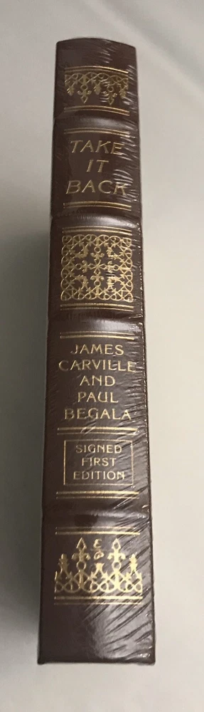 James Carville and Paul Begala Take It Back: Our Party, Our Country, Our Future Signed First Edition Easton Press Leatherbound Collector's Edition This elegant book features full leather binding, 22 kt gold stamping to covers and spine, silk endpapers, a satin ribbon page marker, and all edges gilt. Book is signed by the author on a special signature page. Book is in new condition (in publisher's shrinkwrap). ---------------------------- By being too timid and too weak, too hesitant and too confused, Democrats have allowed Republicans to run amok. Republicans today control everything: the White House, the Congress, the Supreme Court, the federal bureaucracy, the military, and the corporate special interests and their lobbyists. They operate powerful right-wing organizations, right-wing think tanks, and a conservative media that serves as an attack dog against Democrats. Republicans have used their absolute power to corrupt our democracy, degrade our military, weaken our health care system, diminish our stature in the world, damage our environment, reward the rich, hammer the poor, squeeze the middle class, bankrupt our Treasury, and indenture our children to foreign debt holders. In this important book, James Carville and Paul Begala show Democrats how they can "take it back." They offer a clear-eyed critique of their party's failures and make specific, concrete recommendations on how Democrats can avoid losing elections on divisive issues such as abortion, gun control, gay rights, and moral values and start winning them on health care, political reform, energy, the environment, tax reform, and more. Carville and Begala say that liberal Democrats are right that too many establishment Democrats kowtow to corporate interests and shamefully supported George W. Bush's rush to war. And moderate Democrats are right to complain that too many Democrats are out of step with middle-class values, too removed from people of faith, too enthralled with intellectual and cultural elites. But the problem with the Democrats, Carville and Begala argue, is not ideological. It's anatomical. They lack a backbone. "Take ItBack" is a spinal transplant for Democrats and an audacious battle plan for victory.