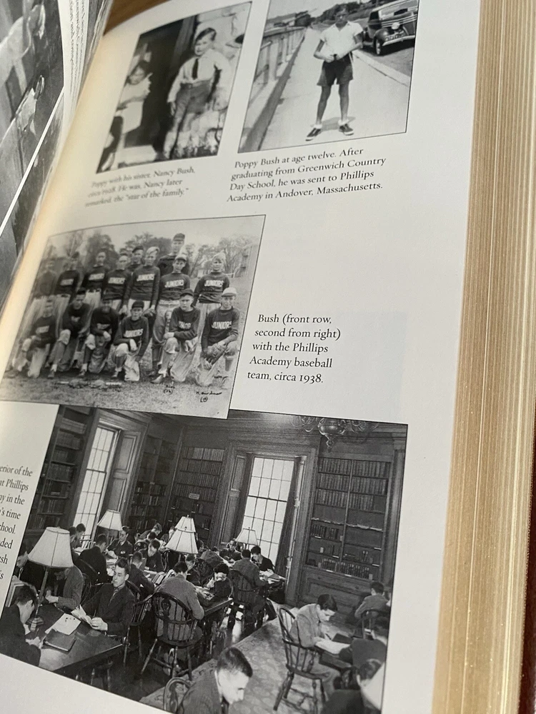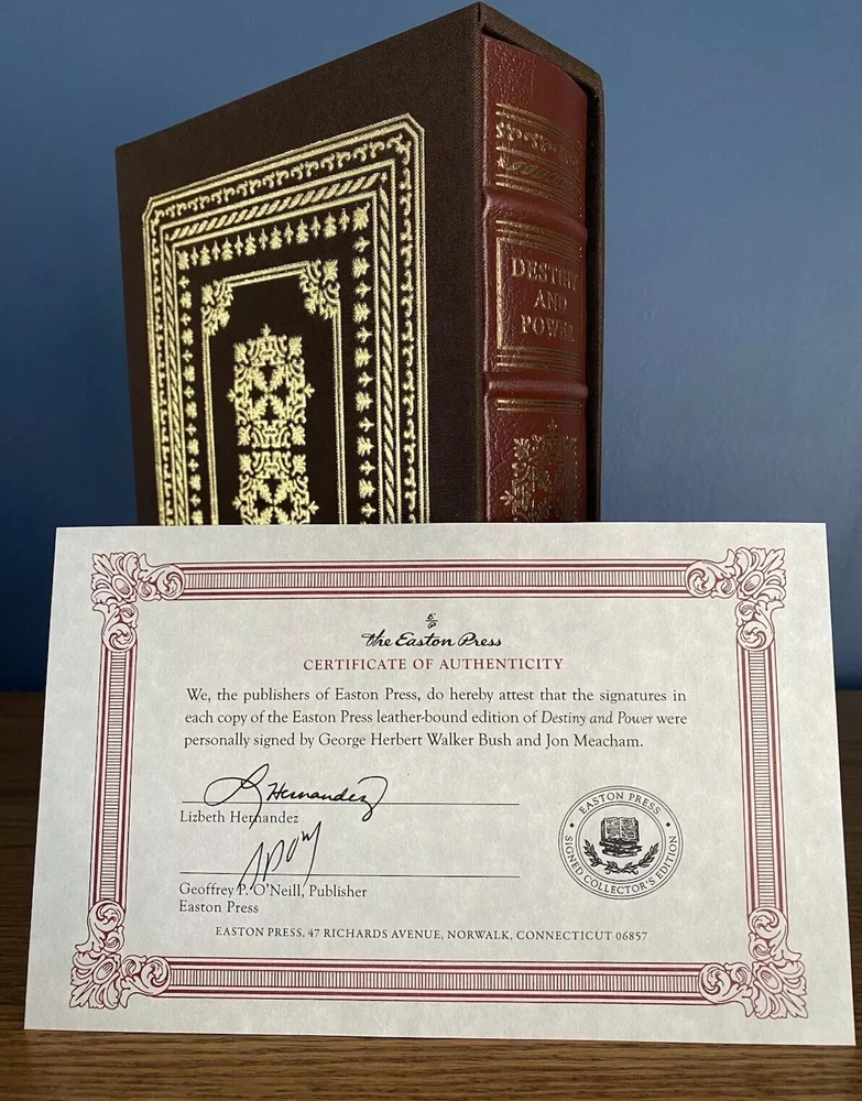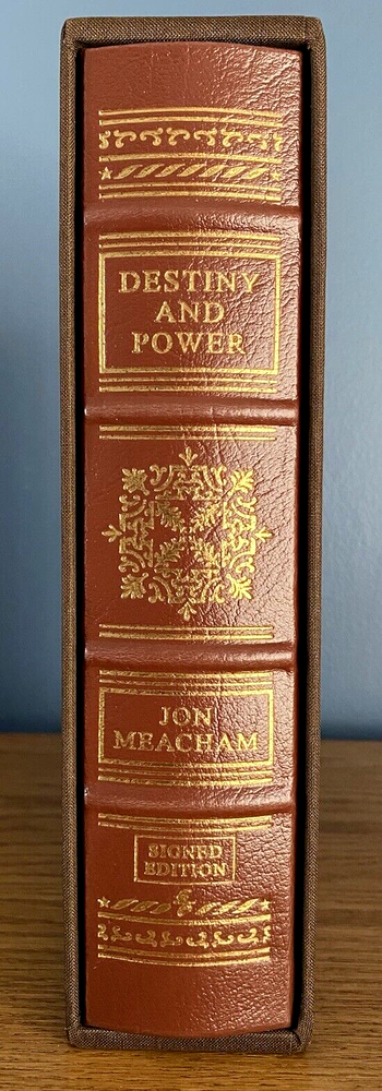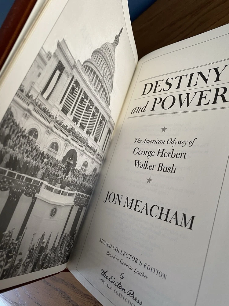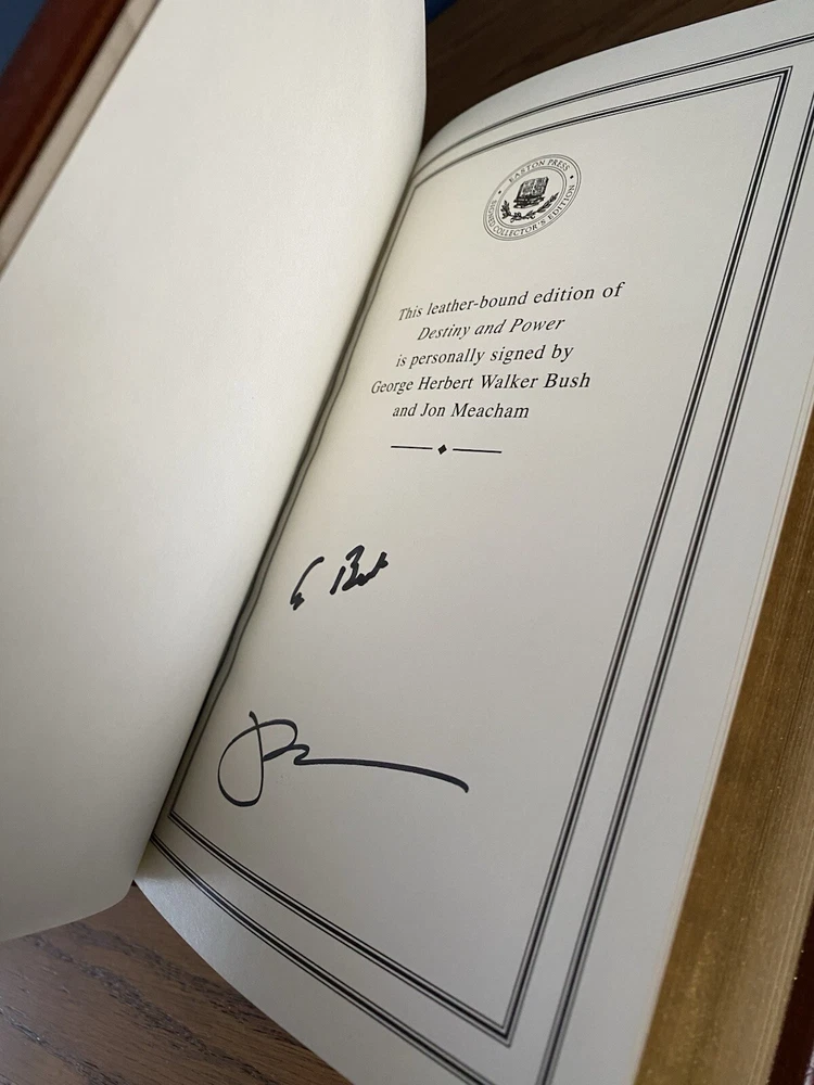 A fascinating biography about one of America's finest presidents, George H.W. Bush. This limited edition copy is personally signed by Bush and biographer, Jon Meacham. Handsomely bound in dark brown leather, this edition has never been read. Simply removed from its factory seal and placed on a shelf. This book will be shipped for free via USPS Media Mail and packaged with ultimate care for its transport. Thanks for your interest, and please let me know if you have any questions.