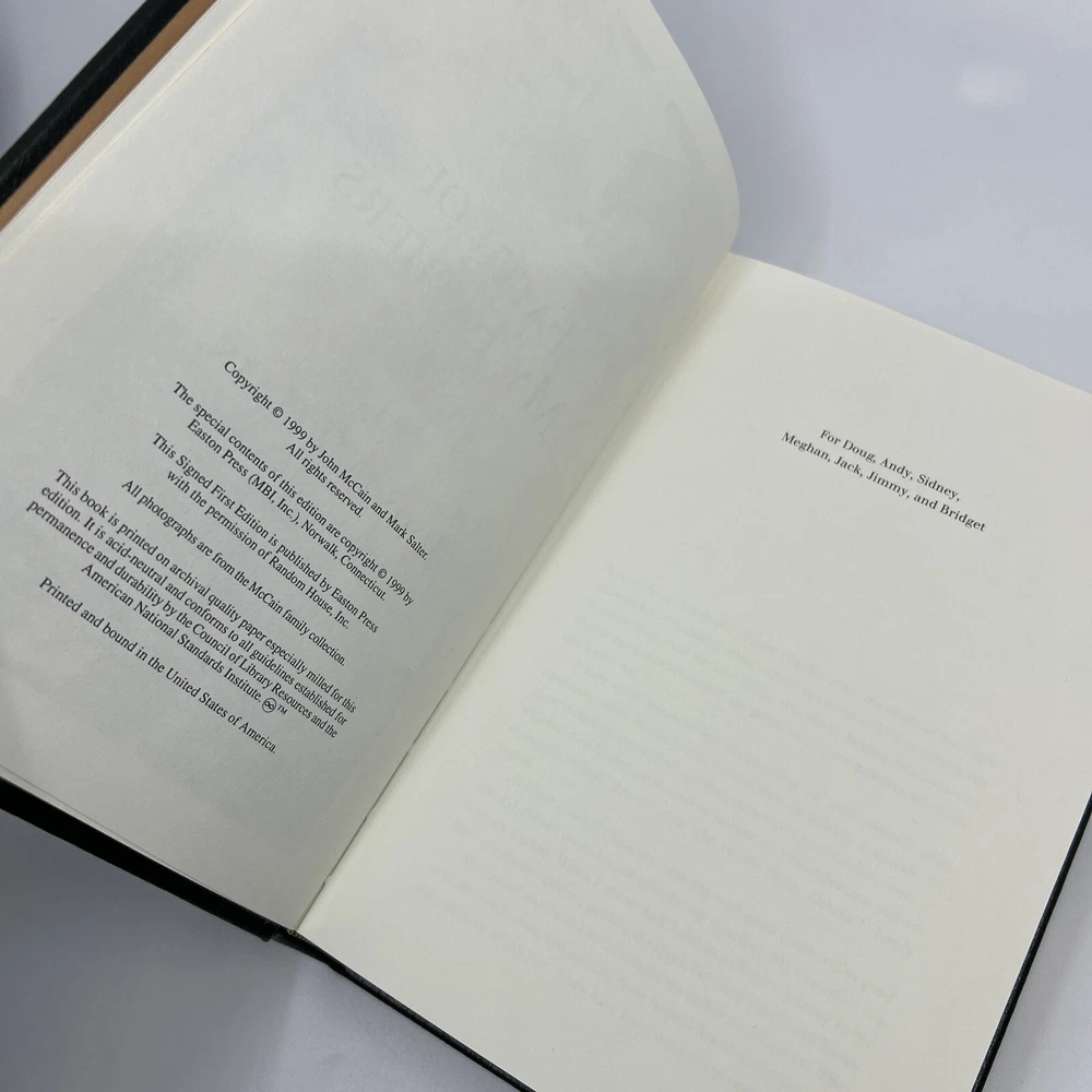 This stunning Easton Press leather-bound signed first edition is a must-have for collectors! Hand-numbered #20/1250 and personally autographed by John McCain, it's in fantastic condition with minimal shelf wear. Includes the COA and bonus blank bookplate—truly a treasure for any serious memorabilia enthusiast. Don't miss this rare piece of history!