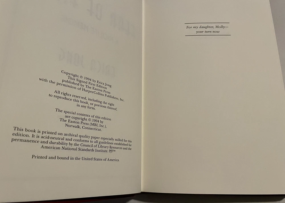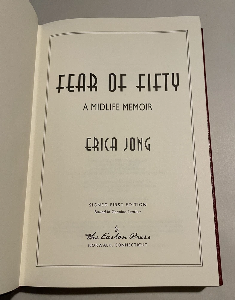 EASTON PRESS Fear of Fifty A Midlife Memoir Erica Jong SIGNED FIRST EDITION Leatherbound collector’s edition is in fine condition (faint edgewear, faint wear to gilt on page edges, no marks inside, no embossed seal, no attached bookplate).