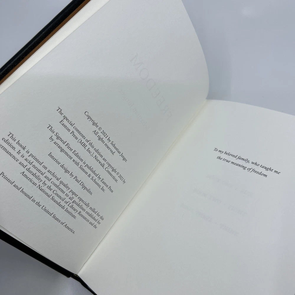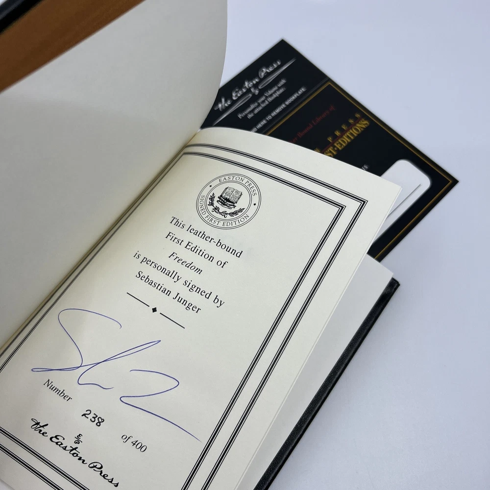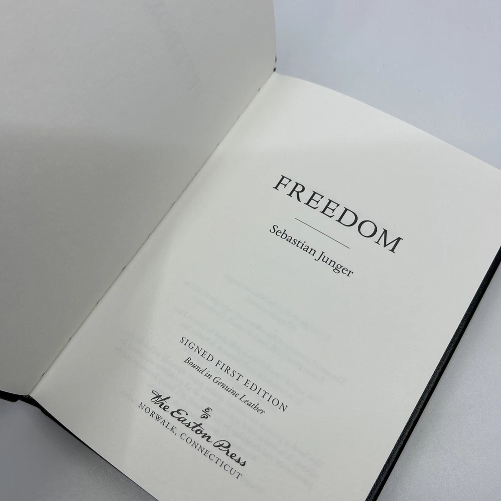 >>> GET IT NOW & ADD IT TO YOUR LIBRARY TODAY! <<< Leather-bound Easton Press collector's SIGNED FIRST EDITION of Freedom by Sebastian Junger (SFE) Limited to 400 hand-numbered copies personally signed by the author, Sebastian Junger Condition – Very Good (+); no attached bookplate/no embossed seal/no signatures or markings ; some shelf wear/marks/scratches/rubbing to page gilt; slight shelf wear/marks/rubbing/dings to leather covers; NO Note & Certificate of Authenticity (COA) included; loose blank bookplate laid in; may have some dust from storage; please see all photos for details - photos are part of description; from an adult only smoke & pet free household; owl not included Shipping – boxed Media Mail or Priority Mail (selectable at checkout); no international shipping (please do not ask) Payment – within two days from the listing's end (Best Offer acceptance) unless prior arrangements have been made No Returns/Sold 'As Is' – please contact me if you have any additional questions/issues or with requests for additional pictures >>> GET IT NOW & ADD IT TO YOUR LIBRARY TODAY! <<< *The only true First Editions (1 st Editions) from Easton Press you can be 100% certain about are books with “Signed First Edition " gilt-stamped on the leather spine or “Signed First Edition " printed on the title page and/or on the signature page. It is impossible to tell if any other Easton Press book is a first edition or first printing. Please keep that in mind and if not sure ask sellers for photos proving their claim. **Easton Press does not provide the actual print date in their books. For "Year Printed" the copyright date is listed (oftentimes from the original Heritage Press editions, rights to which were sold to Easton Press), which may or may not indicate an accurate range for manufacture of the book. ***Please note that Easton Press’s term Collector’s Edition is not synonymous with Limited Edition (LE). The only true Limited Editions from Easton Press are copies hand-numbered on the limitation page (i.e. ‘Number 1 of 1200’ or ‘This edition is strictly limited to a quantity of 1200 copies of which this is number 1’). Please keep that in mind and if not sure ask sellers to prove their claim.