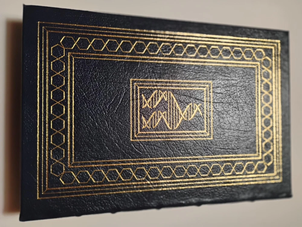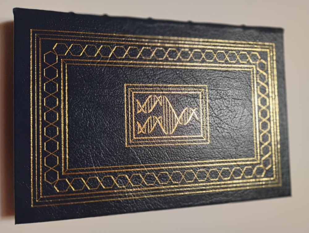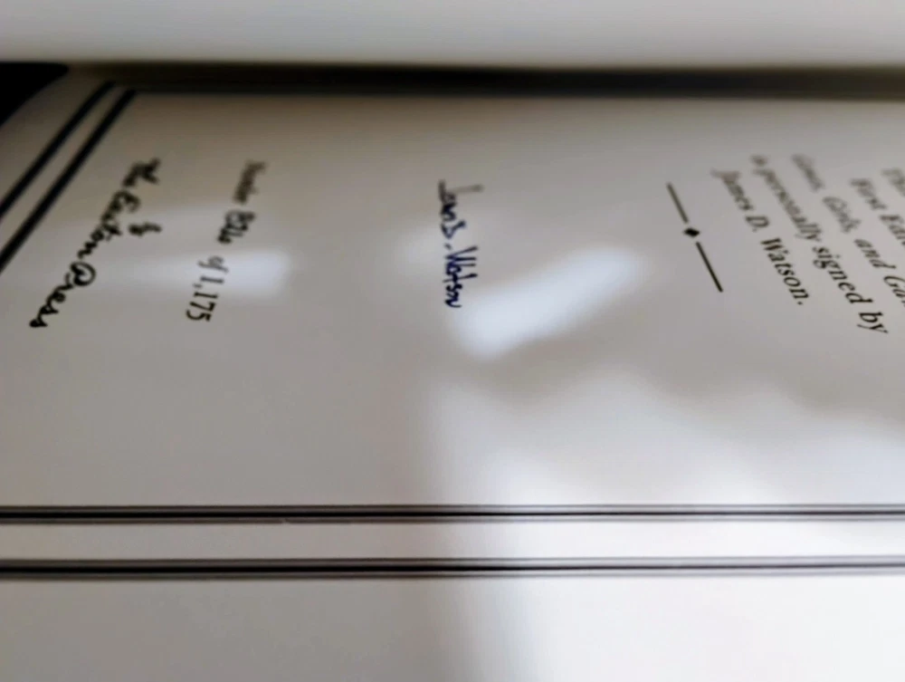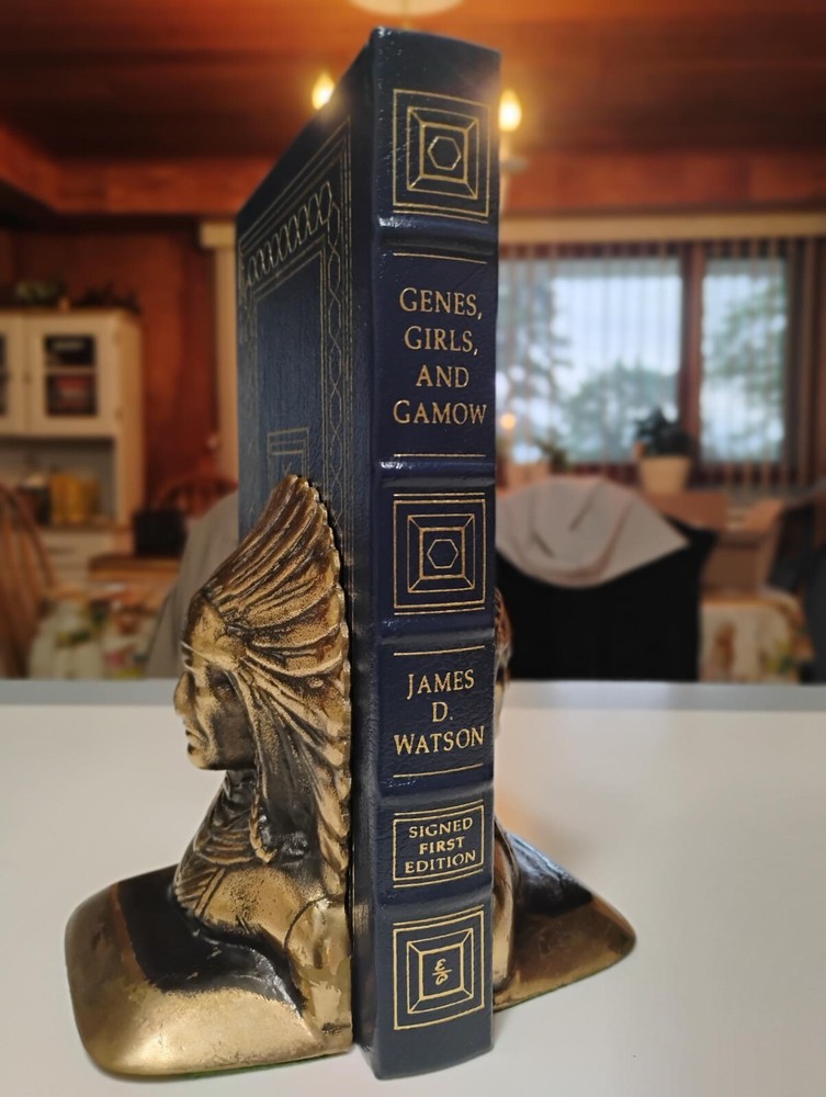 This is a Fine, signed, first edition of “ Genes, Girls, and Gamow: After the Double Helix,” by molecular biologist James Watson published by the Easton Press, with special contents copyrighted by same in 2001. Fine examples of the publisher’s notes and COA are laid in loosely. (#826/1,175). At 259 pages long plus numerous pages of “George Gamow Memorabilia”--that is, images of notebook pages--it is a very sharp, desirable copy, bound in beautiful blue, gold-gilt leather. Unmarked by human hands inside and out, the book is--as usual with Easton-- all edges gilt, with its ribbon marker in fine shape in this surely unread volume with very tight hinges. There are only a couple of the lightest of marks on the edges, so light they do not show well in the photos (sorry!) And, before you ask, no, there are no names nor bookplates, used or not. Overall, this is a beautiful, unread example! We will combine shipping if at all possible--and we will wrap them as if we were shipping them to ourselves! And, yes, returns are allowed if the book does not arrive as described. Questions are more than welcome!