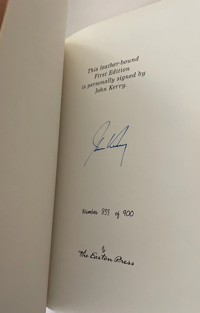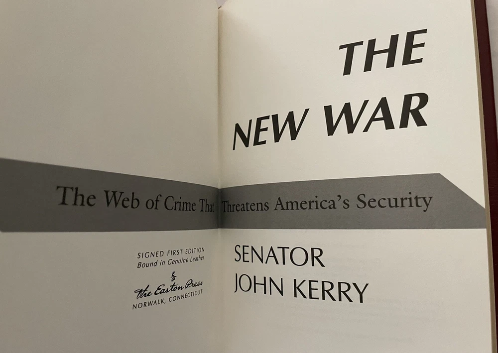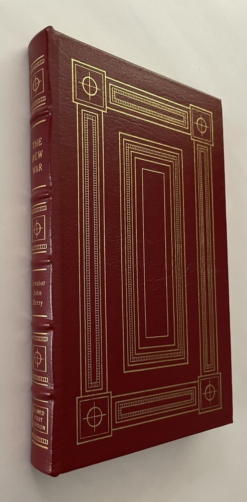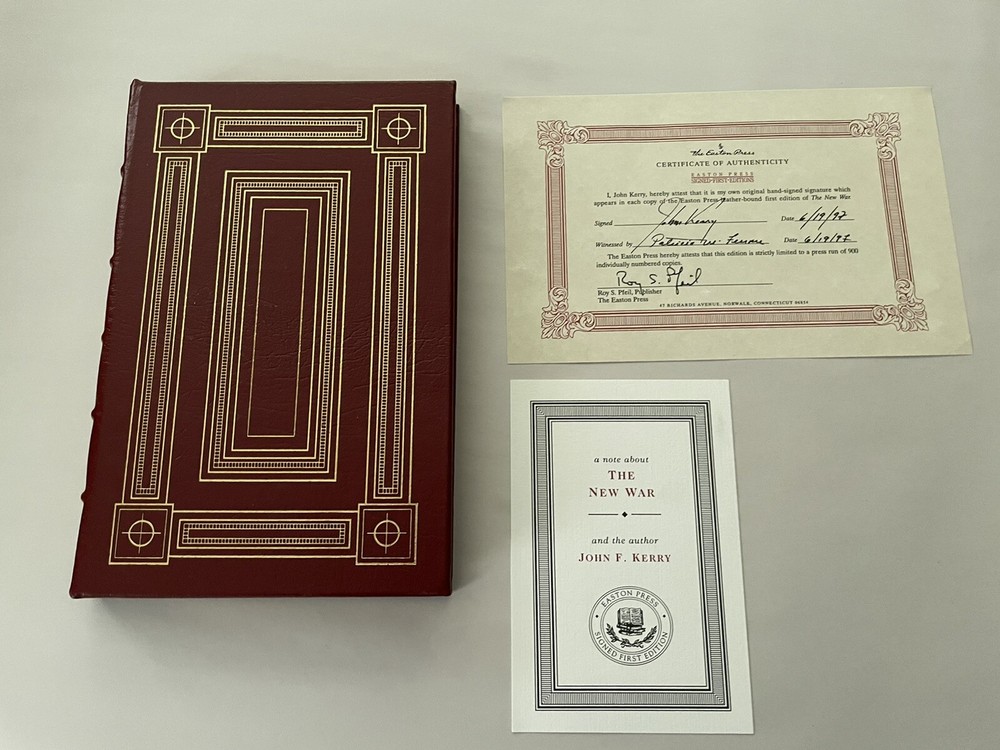John Kerry THE NEW WAR The Web of Crime that Threatens America's Security Signed First Edition Easton Press Leatherbound Collector's Edition All Easton Press books are made in America by skilled craftspeople. Known for their incredible beauty and durability, these books are bound in premium, hand-selected leather and have decorative accents stamped of 22kt. gold. Archival-quality paper is used, which protects the pages from humidity and dryness. Easton Press books also feature hubbed spines, silk moire endpapers, and satin ribbon page markers. Signed by author on special signature page. Includes certificate of authenticity and collector note card laid in (see photo). Book is in near fine condition (faint edgewear, faint wear to gilt on page edges, no attached bookplate, no embossed seal).