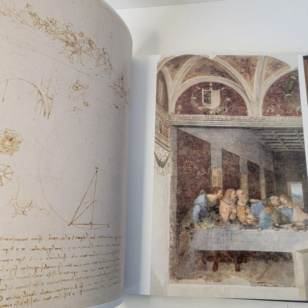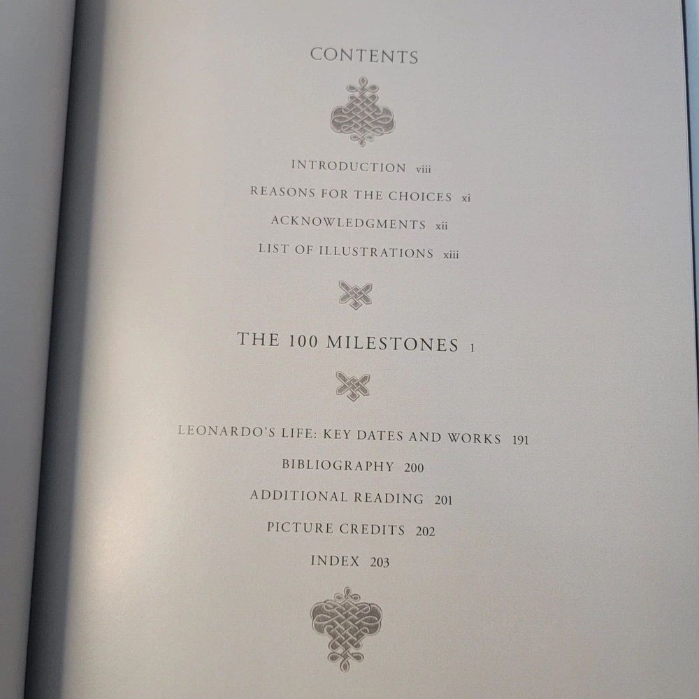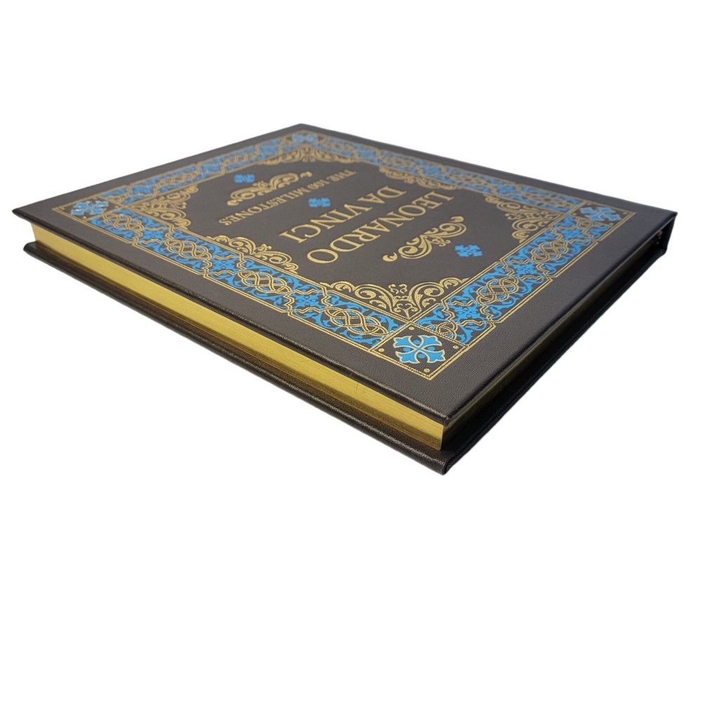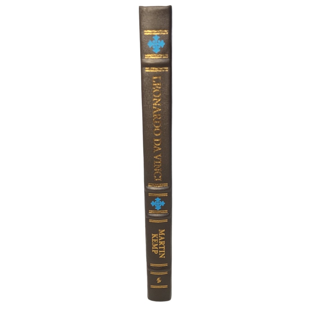 Leonardo Da Vinci: The 100 Milestones by Martin Kemp EASTON PRESS Gorgeous leather binding with raised bands on the spine, gold gilt page edges, silk end papers and a sewn-in satin ribbon Easton Press/Sterling, 2019 Easton/Sterling, 2019. VG+. Minimal shelf wear. Appears unread. Unattached, blank Easton bookplate laid in front cover. Gorgeous leather binding with gold gilt and blue titling and illustration covers, gold gilt page edges, silk end-papers and a sewn-in satin ribbon. Interior pages are clean, bright and tight. A stunning copy.