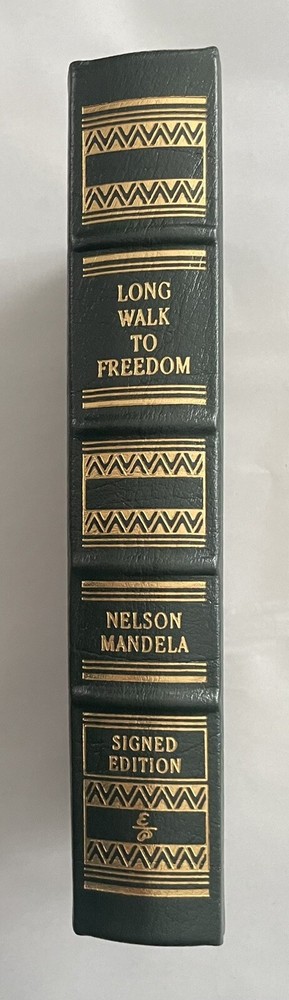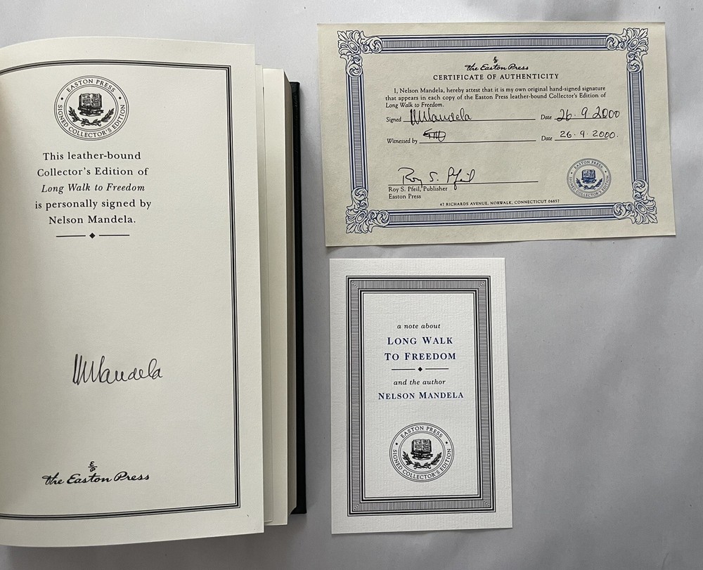 EASTON PRESS Long Walk to Freedom SIGNED Beautiful leatherbound edition signed by Nelson Mandela on a special signature page. Includes certificate of authenticity and card issued by Easton Press that describes the book laid in (see photo). Book features full leather binding, 22-kt. gold stamping on the covers and spine, silk endpapers, a satin ribbon page marker, and all edges gilt. Book is in near fine condition (faint wear to gilt on page edges, no attached bookplate, no embossed seal).