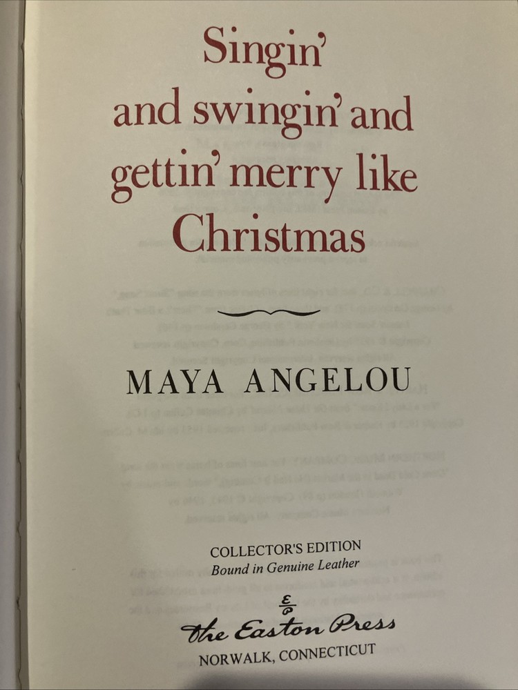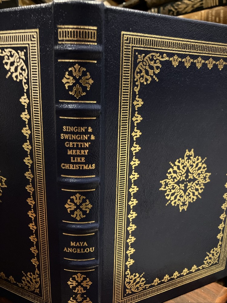 Easton Press leather edition of Maya Angelou's "Singin' and Swingin and gettin' Merry Like Christmas," a COLLECTOR'S edition, published in 2006. Bound in hunter green leather, the book has camel tan moire silk end leaves, acid-free paper, Symth-sewn binding, a satin book marker, hubbed spine, gold gilding on three edges----in FINE condition---opened from SHRINK WRAP for photos. Maya Angelou, who lived from 1928--2014, was an American poet, novelist, and civil rights activist. Her first novel, "I Know Why the Caged Bird Sings," tells of her life up to age of 17. When Maya was four and her brother five years old and living in California, their father put them on a train and sent them to their grandmother, Anna Henderson, in STAMPS, ARKANSAS. They arrived on a train---without adults- and their grandmother raised the two children who were contented and happy in the highly segregated small town---because the grandmother was a fine lady and successful business woman. "Singin' and Swingin" is the third book of her memoirs, set between 1949 and 1955. In this volume, Angelou describes her struggles to support her young son, form meaningful relationships, and forge a successful career. Angelous's stereotypes about race and race relations are challenged. She changed her name from Marguerite Johnson to Maya Angelou for professional reasons. Her young son changed his name from Clyde to Guy. Angelou wrote that her salary from the little real estate office and the dress shop downtown barely paid the rent and my son's baby sitter. "Courtesy cost nothing as long as one had dignity. My Arkansas grandmother, Annie Henderson, had taught me that." "I read Thorne Smith to Clyde and recited Paul Dunbar's poems to him in a thick Black Southern accent. My life was an assemblage of strivings and my energies were directed toward acquiring more than the basic needs. In the record store, I lived fantasy lives through the maudlin melodies of the forties and fifties. Louise Cox and her mother were practicing Christian Scientists. I accepted an invitation to visit their church. No stamping of feet or clapping of hands accompanied the worship. For the whole service, time seemed suspended and reality was just beyond the simple and expensive heavy doors." Angelous wrote: "Because I was tall, I should be very grand, possibly from a long line of African kings. And I had studied African dance with Pearl Primus. I did not know African, but I did speak Spanish. Later as a singer and entertainer, Maya visited Yugoslavia, Greece, Tel Aviv and the 'dark continent'---Africa! In Egypt, "A Pharaonic tomb rose above my head and I shivered. Israelites and Nubians and slaves from Carthage and Mesopotamia has built it, sweating and bleeding, and finally dying for the mass of stones which would become in the twentieth century no more than the focus for tourists' cameras. After a few weeks in Rome, Maya and Clyde returned to the U.S. when her mother became sick. Then Maya received a telegram from Hawaii that read: "OPENING FOR YOU THE COULDS. $350 DOLLAR WEEKLY, FOUR WEEKS. TWO WEEK OPTION. TRANSPORTATION AND ACCOMMODATION YOU AND SON. REPLY AT ONCE. In 1991, Angelou recited her poem, "On the Pulse of Morning" at the inauguration of fellow Arkansan, PRESIDENT BILL CLINTON, the first poet to make an inaugural recitation since ROBERT FROST at JOHN F. KENNEDY'S in 1961. 212 pages. I offer combined shipping.