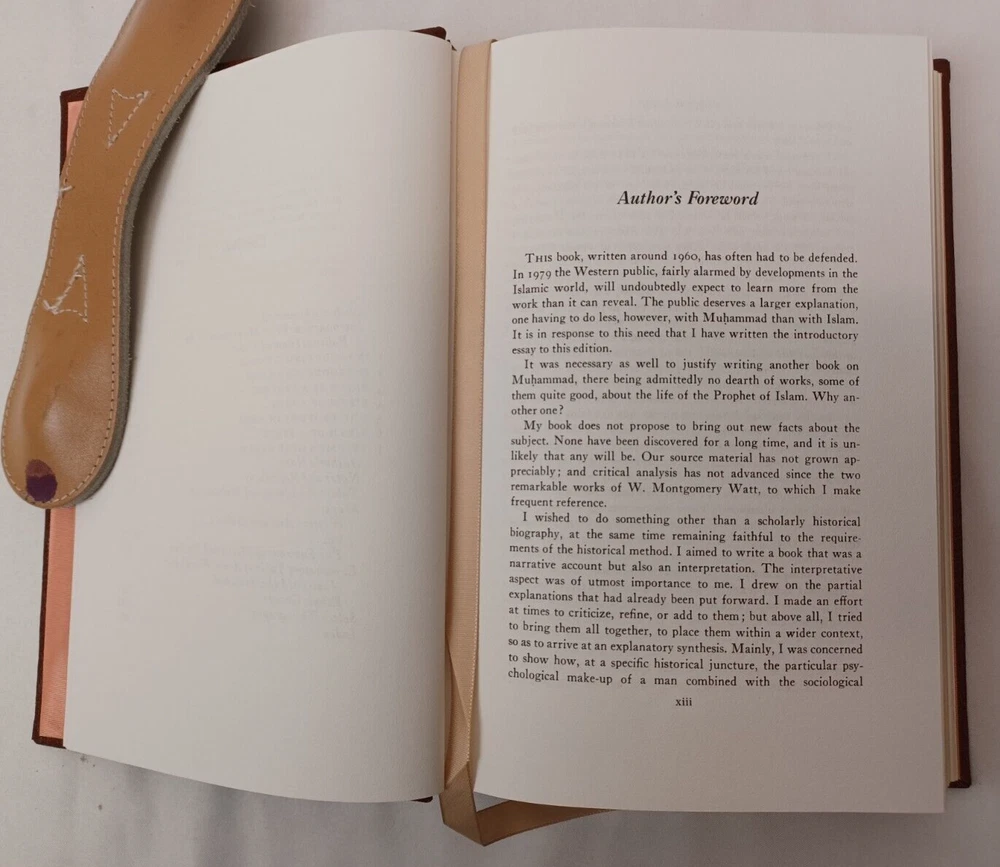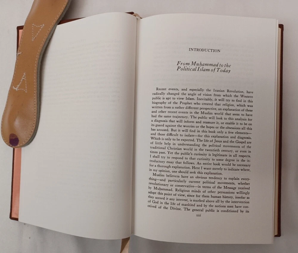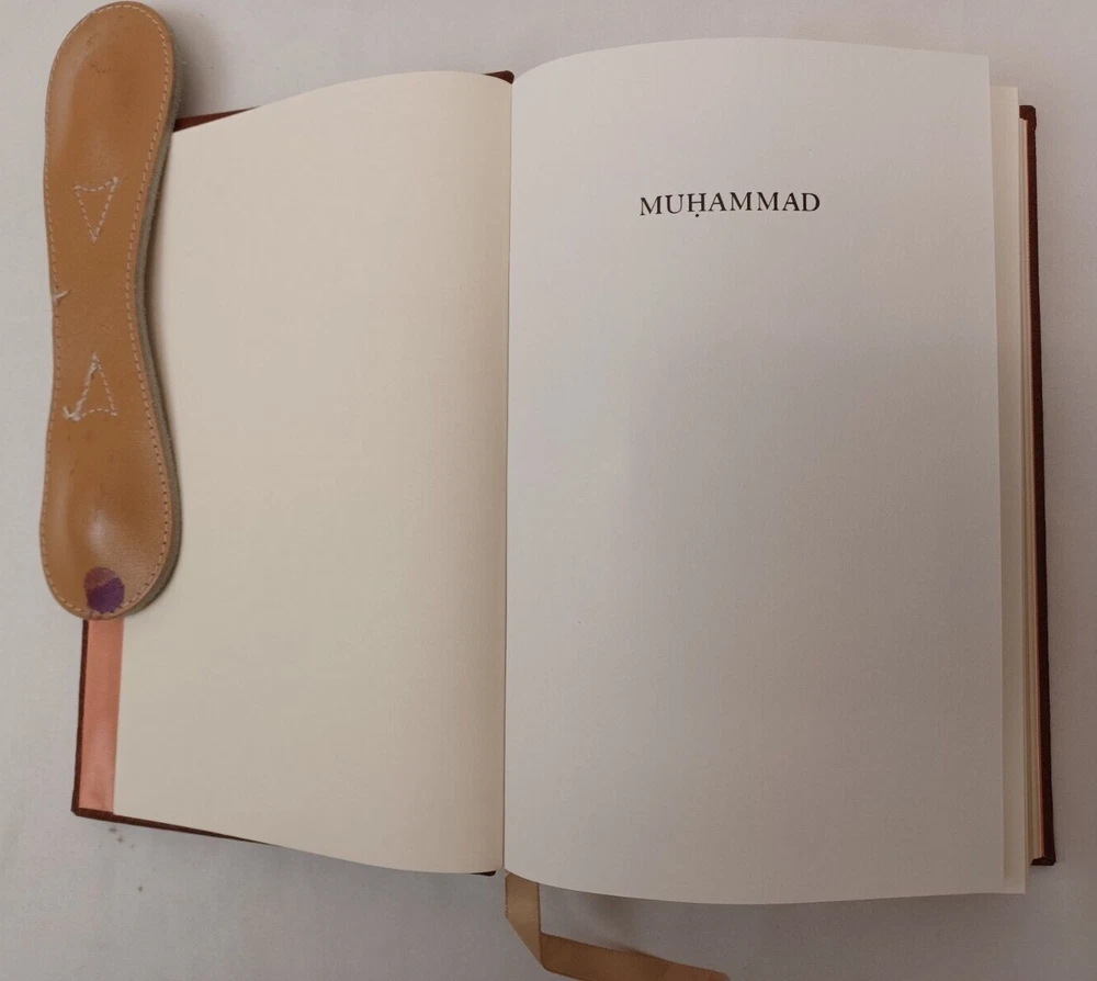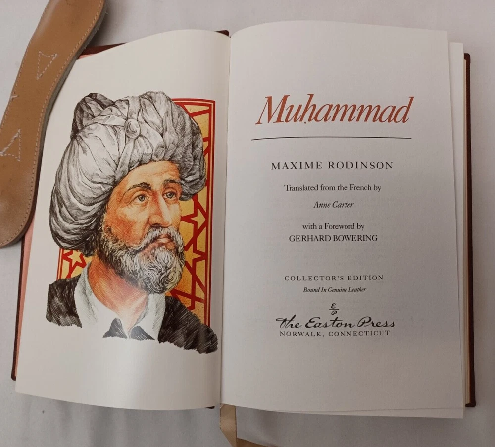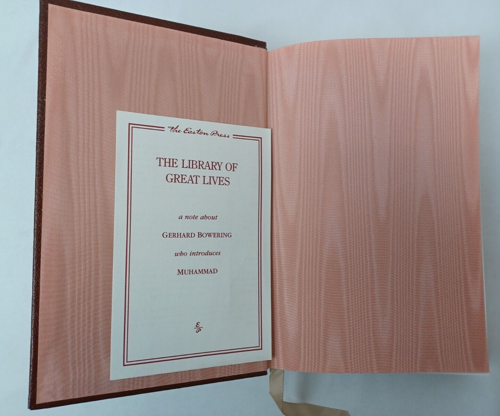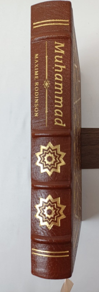Easton Press: Muhammad. By Maxime Rodinson. Published by Easton Press, Norwalk, Connecticut, 1989. Collector's Edition in Genuine Leather. Approx. 8-3/4" x 5-3/4" x 1-1/2". Silk moire endpapers and satin bookmark. Gilt edges, lettering on spine and embossing on front cover. Book is near fine condition with minimal wear. Gilt is slightly worn in some areas. Tight, square and unmarked. Satin bookmark has slight fraying. See photos attached. DI