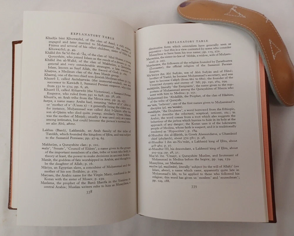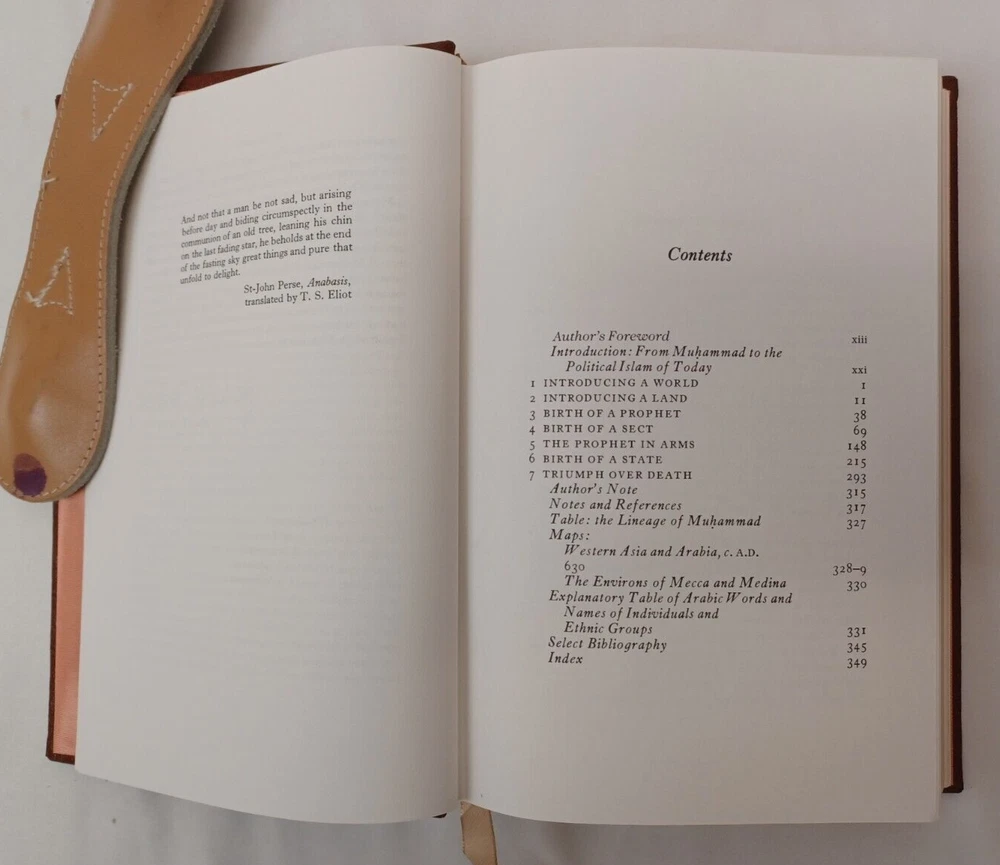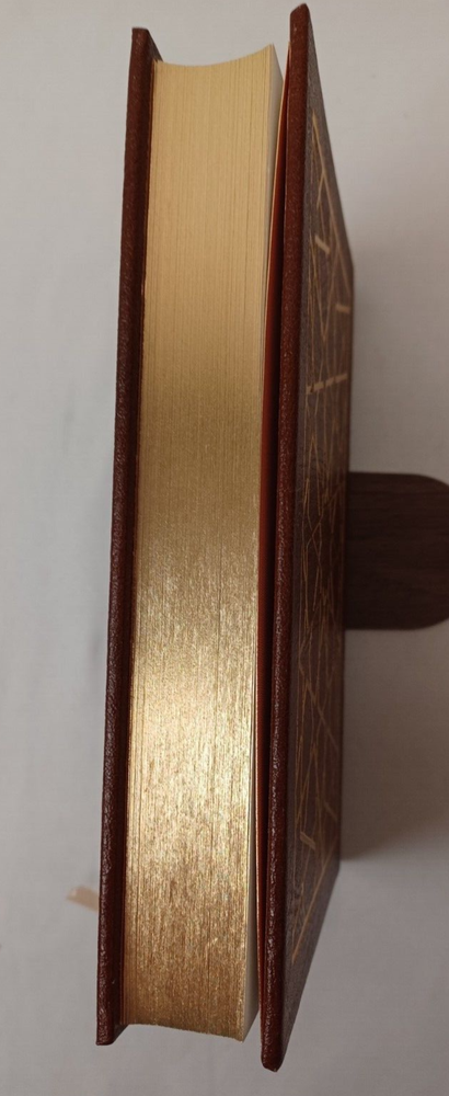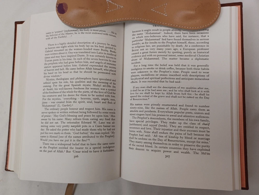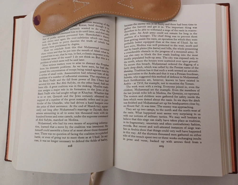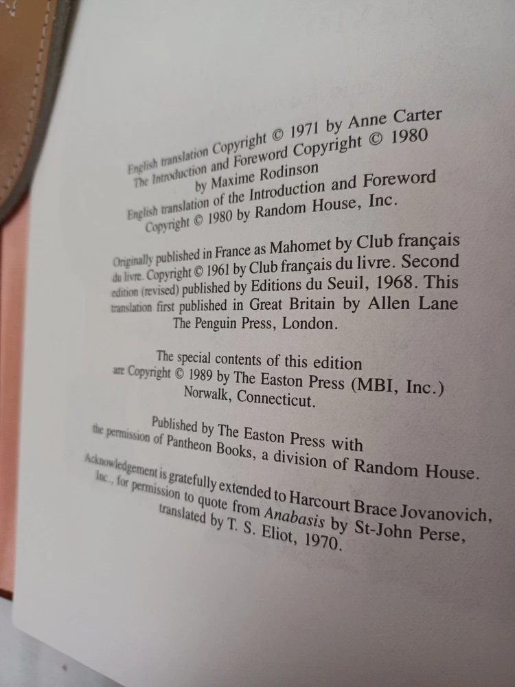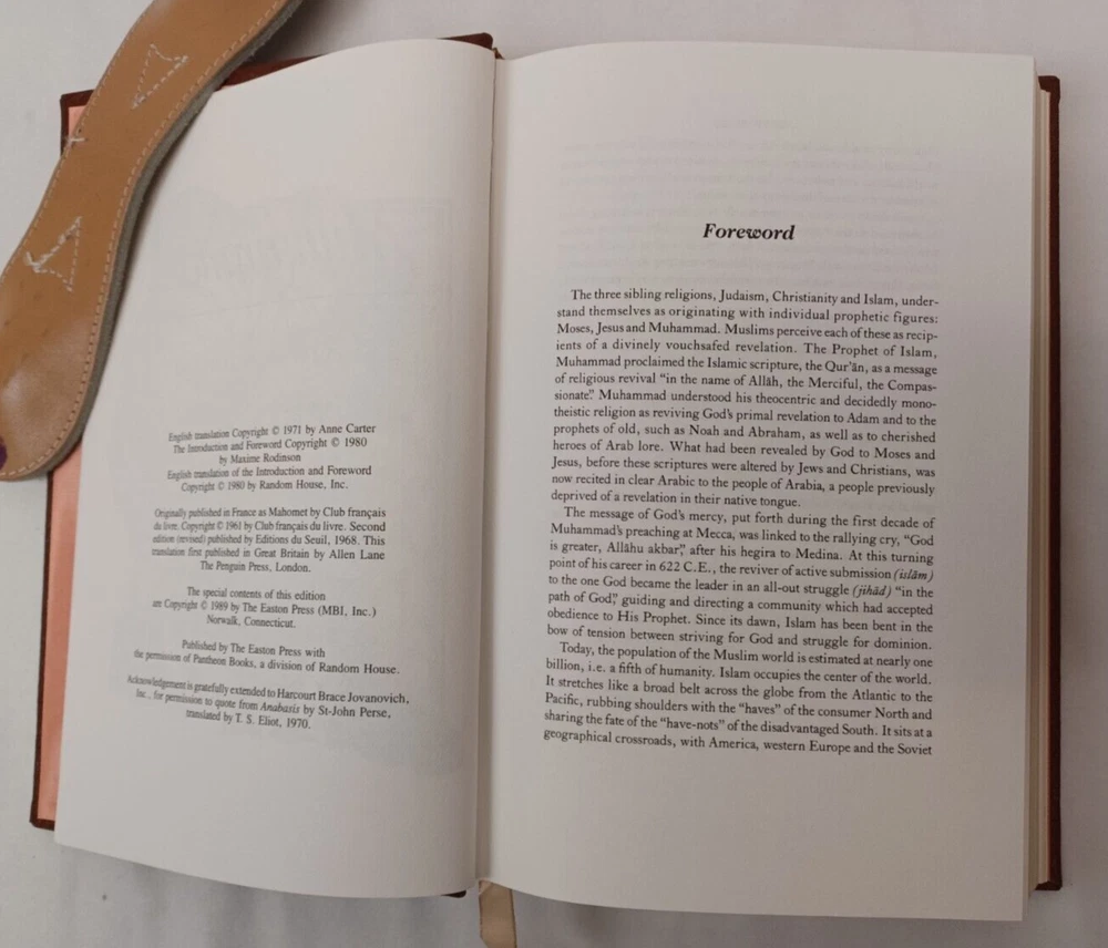 Easton Press: Muhammad. By Maxime Rodinson. Published by Easton Press, Norwalk, Connecticut, 1989. Collector's Edition in Genuine Leather. Approx. 8-3/4" x 5-3/4" x 1-1/2". Silk moire endpapers and satin bookmark. Gilt edges, lettering on spine and embossing on front cover. Book is near fine condition with minimal wear. Gilt is slightly worn in some areas. Tight, square and unmarked. Satin bookmark has slight fraying. See photos attached. DI