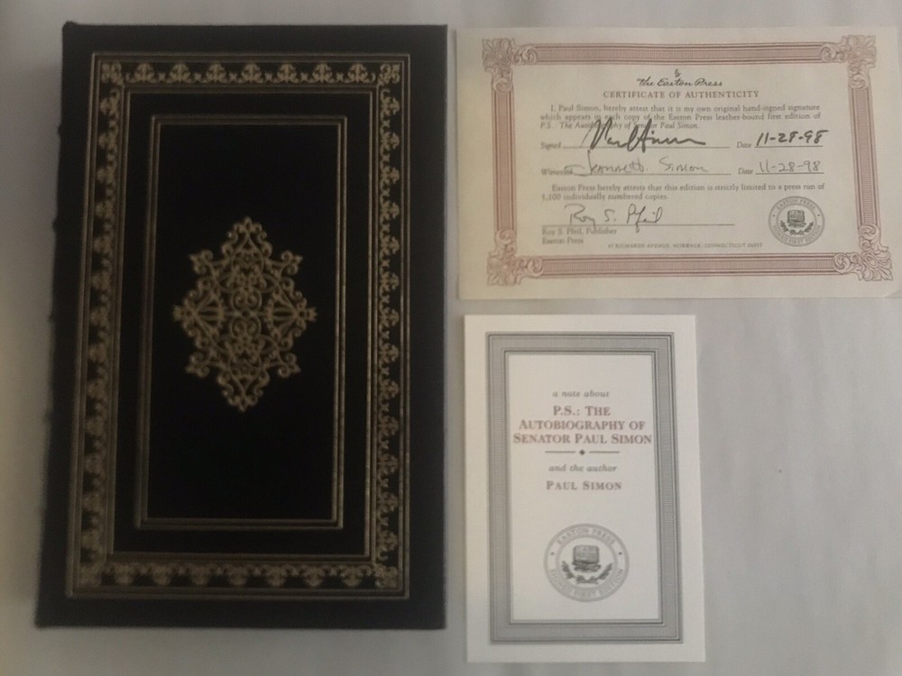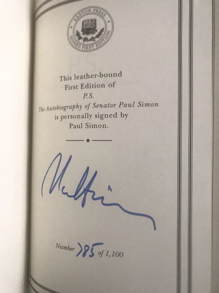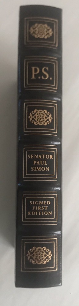 P.S. THE AUTOBIOGRAPHY OF SENATOR PAUL SIMON Signed First Edition Easton Press Leatherbound Collector's Edition Book features a full leather binding, 22-kt gold stamping to the cover and spine, silk endpapers, archival paper, and a satin ribbon page marker. It is signed by the author on a special signature page (see photo). Book is in fine condition (faint edgewear, faint wear to gilt on page edges--see last photo). There is no writing inside, no attached bookplate, and no embossed seal). Includes certificate of authenticity and collector note card laid in.