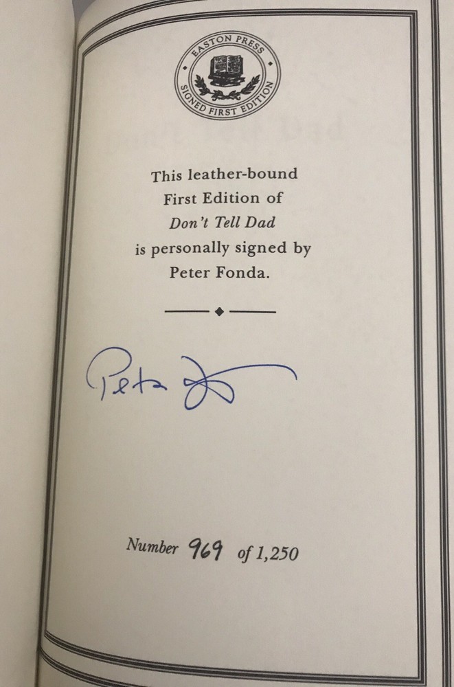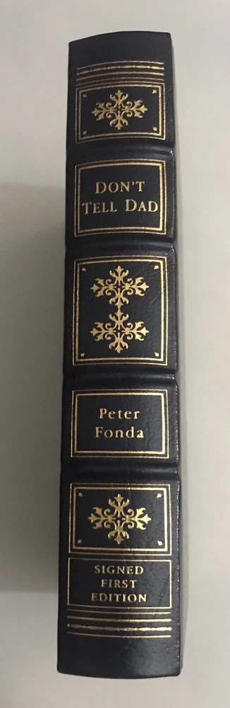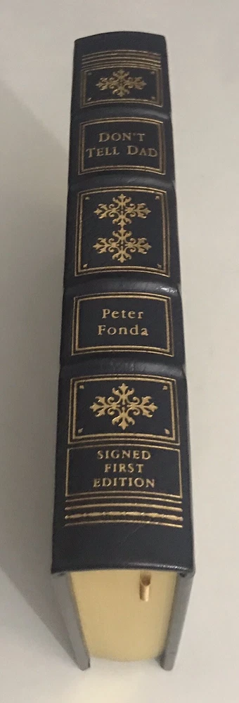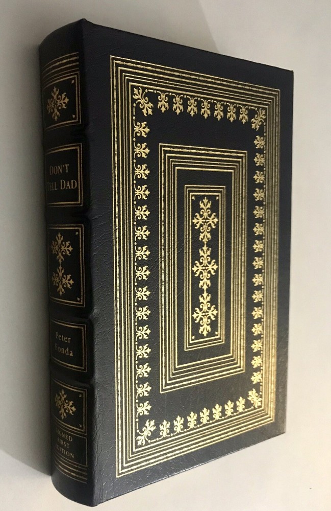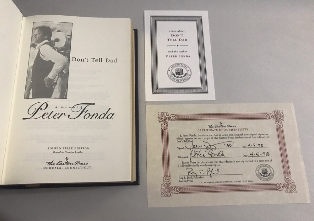Peter Fonda DON'T TELL DAD Signed First Edition Easton Press Leatherbound Collector's Edition Book features a full leather binding, 22-kt gold stamping to the cover and spine, silk endpapers, archival paper, and a satin ribbon page marker. It is signed by the author on a special signature page (see photo). Limited to 1250 copies. Book is in very good condition (very slight edgewear/rubbing, no writing inside other than author's signature, no highlighting, no creased pages, no attached bookplate, no embossed seal). Includes certificate of authenticity and card that describes book laid in.