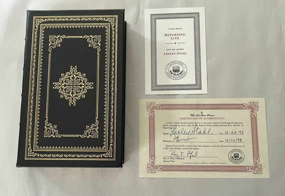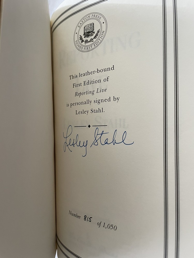 EASTON PRESS Reporting Live by Lesley Stahl SIGNED FIRST EDITION Leatherbound book is in near fine condition (faint edgewear, faint wear to gilt on page edges, no attached bookplate, no embossed seal)...