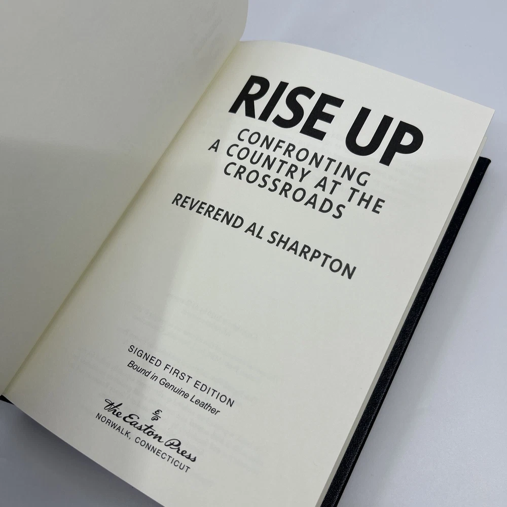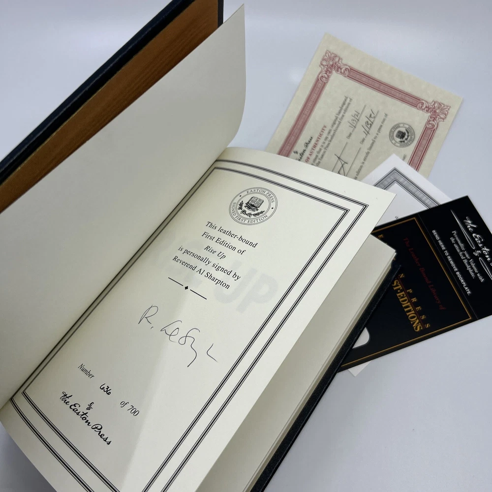 >>> GET IT NOW & ADD IT TO YOUR LIBRARY TODAY! <<< Leather-bound Easton Press collector's SIGNED FIRST EDITION of Rise Up: Confronting a Country at the Crossroads by Reverend Al Sharpton (SFE) Limited to 700 hand-numbered copies personally signed by the author, Reverend Al Sharpton Condition – Very Good/Excellent; no attached bookplate /no embossed seal/no signatures or markings ; slight shelf wear/marks/scratches/rubbing to page gilt & leather covers; original Note & Certificate of Authenticity (COA) included; loose blank bookplate laid in; may have some dust from storage; please see all photos for details - photos are part of description; from an adult only smoke & pet free household; owl not included Shipping – boxed USPS Media Mail or Priority Mail (selectable at checkout); no international shipping (please do not ask) Payment – within two days from the listing's end (Best Offer acceptance) unless prior arrangements have been made No Returns/Sold 'As Is' – please contact me if you have any additional questions/issues or with requests for additional pictures >>> GET IT NOW & ADD IT TO YOUR LIBRARY TODAY! <<< *The only true First Editions (1 st Editions) from Easton Press you can be 100% certain about are books with “Signed First Edition " gilt-stamped on the leather spine or “Signed First Edition " printed on the title page and/or on the signature page. It is impossible to tell if any other Easton Press book is a first edition or first printing. Please keep that in mind and if not sure ask sellers for photos proving their claim. **Easton Press does not provide the actual print date in their books. For "Year Printed" the copyright date is listed (oftentimes from the original Heritage Press editions, rights to which were sold to Easton Press), which may or may not indicate an accurate range for manufacture of the book. ***Please note that Easton Press’s term Collector’s Edition is not synonymous with Limited Edition (LE). The only true Limited Editions from Easton Press are copies hand-numbered on the limitation page (i.e. ‘Number 1 of 1200’ or ‘This edition is strictly limited to a quantity of 1200 copies of which this is number 1’). Please keep that in mind and if not sure ask sellers to prove their claim.