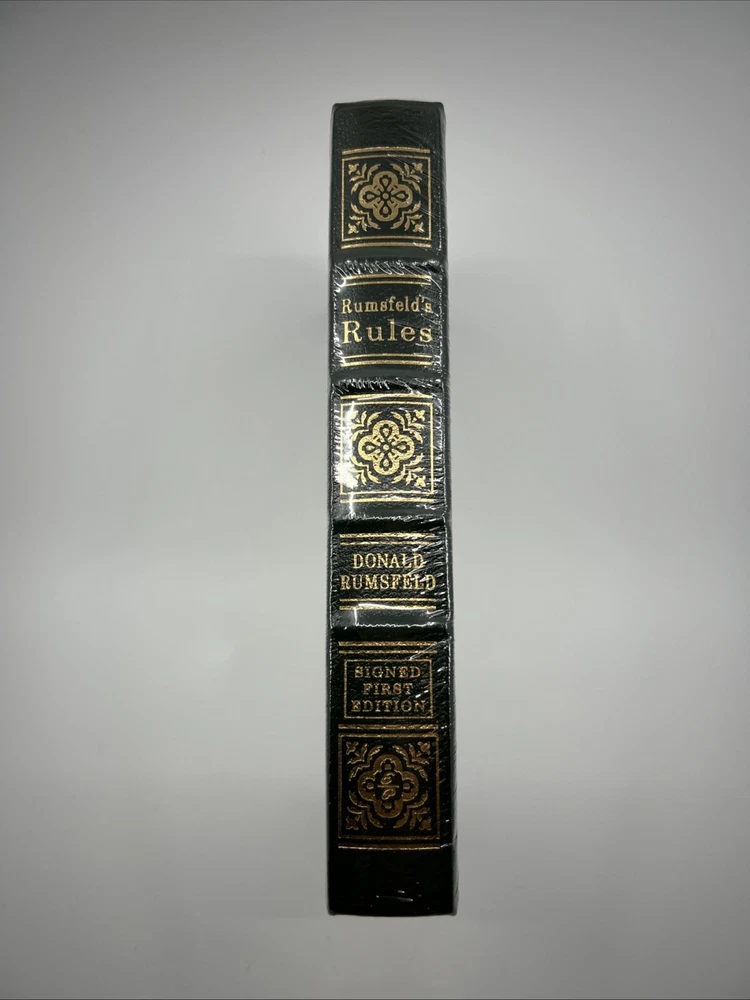 >>> GET IT NOW & ADD IT TO YOUR LIBRARY TODAY! <<< Leather-bound Easton Press collector's SIGNED FIRST EDITION of Rumsfeld's Rules by Donald Rumsfeld (SFE) Limited to 600 copies personally signed by Donald Rumsfeld Limitation number unknown due to book still being sealed Condition – Still sealed in publisher's original shrinkwrap; original Note & Certificate of Authenticity (COA) enclosed inside; loose blank bookplate included; may have minor shelf wear/marks & some dust from storage; please see all photos for details - photos are part of description; from an adult only smoke & pet free household; owl not included Shipping – boxed USPS Media Mail or Priority Mail (selectable at checkout); no international shipping (please do not ask) Payment – within two days from the listing's end (Best Offer acceptance) unless prior arrangements have been made No Returns/Sold 'As Is' – please contact me if you have any additional questions/issues or with requests for additional pictures >>> GET IT NOW & ADD IT TO YOUR LIBRARY TODAY! <<< *The only true First Editions (1 st Editions) from Easton Press you can be 100% certain about are books with “Signed First Edition " gilt-stamped on the leather spine or “Signed First Edition " printed on the title page and/or on the signature page. It is impossible to tell if any other Easton Press book is a first edition or first printing. Please keep that in mind and if not sure ask sellers for photos proving their claim. **Easton Press does not provide the actual print date in their books. For "Year Printed" the copyright date is listed (oftentimes from the original Heritage Press editions, rights to which were sold to Easton Press), which may or may not indicate an accurate range for manufacture of the book. ***Please note that Easton Press’s term Collector’s Edition is not synonymous with Limited Edition (LE). The only true Limited Editions from Easton Press are copies hand-numbered on the limitation page (i.e. ‘Number 1 of 1200’ or ‘This edition is strictly limited to a quantity of 1200 copies of which this is number 1’). Please keep that in mind and if not sure ask sellers to prove their claim.