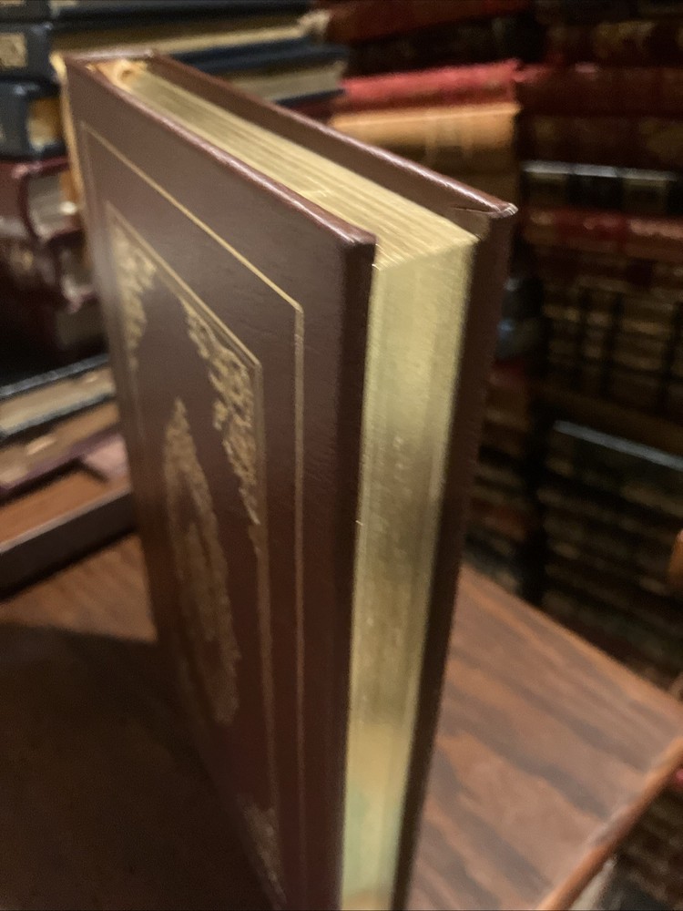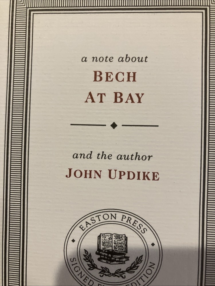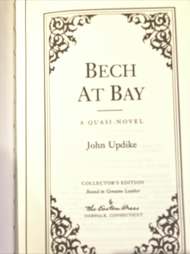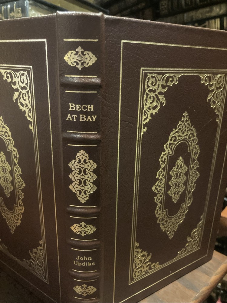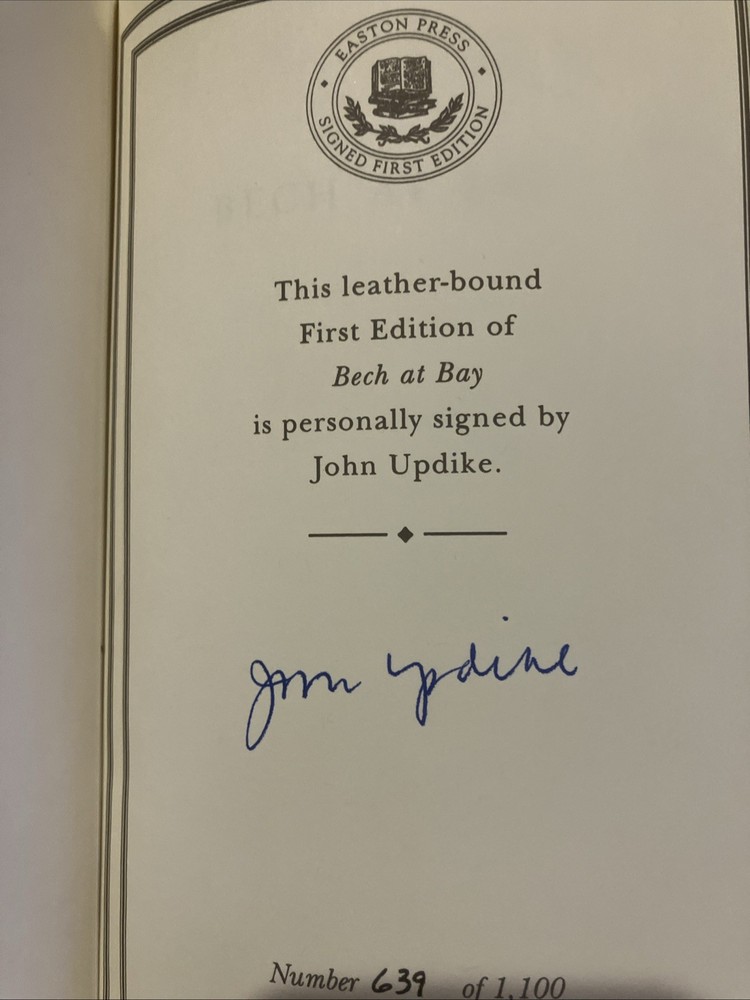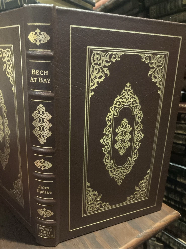 Easton Press leather edition of John Updike's "Beck at Bay: A Quasi-Novel," a COLLECTOR'S edition, a First Edition, Personally signed by JOHN UPDIKE, this book numbered 639 out of 1,100, published in 1989. Bound in brown leather, the book has camel tan French moire silk end leaves, a satin book marker, symth-sewn binding, hubbed spine, gold gilding on three edges---in near FINE condition. John Hoyer Updike, who lived from 1932--2009, was an American novelist and short story writer. In this final volume of Updike's mock-heroic trilogy, the Jewish-American hero is older but scarcely wise. Now in his seventies, he remains competitive, lecherous, and self-absorbed, lost in a brave new literary world where his books are hyped by Swiss-owned conglomeration and showcased in chain stores attached to expresso bars. Bech is an irascible and long-suffering New York writer. In the opening chapter, in 1986, sixty-three year old Henry Bech visits the American Ambassador's residence in Prague in the last palace built in Europe with its long corridors, silk panels, marble-topped hall tables, and Metallicized oaken doors. As a Jew, Bech was conscious of the former owners, those "vanished plutocrats---elegant and multilingual---in the castle built by a rich Jewish banker, Otto Petschek," whose family fled Hitler and the castle. At the Ambassador's insistence, Bech visits the old Jewish cemetery and FRANZ KAFKA's grave in the new Jewish cemetery. In Czechoslovakia, Bech felt desperately unworthy, the unlucky country seemed to see in him an emblem of hope. Other chapters in the novel include: "Bech Presides," "Bech Pleads Guilty," "Bech Noir," and "Bech and the Bounty of Sweden," where Bech it was announced in a---"storm of protest---" that Bech had won the 1999 Nobel Prize for Literature. The POST editors were stunned and the front-page said, "this turns the Prize into a prank." Bech in his heart agreed but he began his acceptance speech: "Royal Highnesses, Mr. Lord Mayor of Stockholm, Members of the Academy, distinguished guests both foreign and domestic, the Nobel Prize has become so big, so rich and famous . . .there is no one worthy to win it. . .Later Bech enjoyed the banquet in the vast Blue Hall of Stockholm's red-brick City Hall with the thirteen hunderd guests eating a special Nobel dinner while the Uppsala male choir sang and young women in blue peasant outfits danced down the broad stairs. Stockholm, scattered on its Baltic archipelago, shone with the cold. Swedish women sported blood-bright cheeks above their collars of wolf and fox as they carried their golden heads along the trendy streets, lined with restaurants and antique stores." Bech later says that "I don't think God plays well in Sweden. God sticks pretty close to the equator." 241 pages. I offer combined shipping.