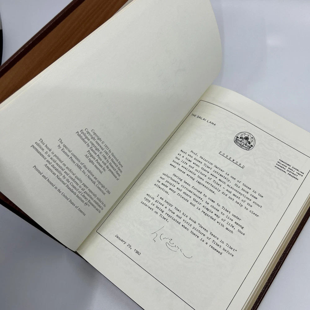 >>> GET IT NOW & ADD IT TO YOUR LIBRARY TODAY! <<< Leather-bound Easton Press collector's SIGNED EDITION of Seven Years in Tibet by Heinrich Harrer (SE) Condition – Very Good/Excellent; no attached bookplate/no embossed seal/no signatures or markings ; slight shelf wear/marks/scratches/rubbing/dings to page gilt; slight shelf wear/marks/rubbing/bumps to leather covers; original Certificate of Authenticity (COA) included; NO Note included; loose blank bookplate laid in; may have some dust from storage; please see all photos for details - photos are part of description; from an adult only smoke & pet free household; owl not included Shipping – boxed USPS Media Mail or Priority Mail (selectable at checkout); no international shipping (please do not ask) Payment – within two days from the listing's end (Best Offer acceptance) unless prior arrangements have been made No Returns/Sold 'As Is' – please contact me if you have any additional questions/issues or with requests for additional pictures >>> GET IT NOW & ADD IT TO YOUR LIBRARY TODAY! <<< *The only true First Editions (1 st Editions) from Easton Press you can be 100% certain about are books with “Signed First Edition " gilt-stamped on the leather spine or “Signed First Edition " printed on the title page and/or on the signature page. It is impossible to tell if any other Easton Press book is a first edition or first printing. Please keep that in mind and if not sure ask sellers for photos proving their claim. **Easton Press does not provide the actual print date in their books. For "Year Printed" the copyright date is listed (oftentimes from the original Heritage Press editions, rights to which were sold to Easton Press), which may or may not indicate an accurate range for manufacture of the book. ***Please note that Easton Press’s term Collector’s Edition is not synonymous with Limited Edition (LE). The only true Limited Editions from Easton Press are copies hand-numbered on the limitation page (i.e. ‘Number 1 of 1200’ or ‘This edition is strictly limited to a quantity of 1200 copies of which this is number 1’). Please keep that in mind and if not sure ask sellers to prove their claim.