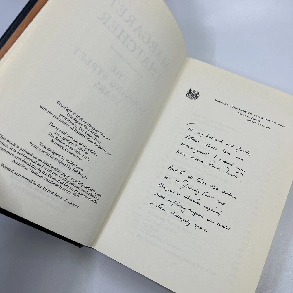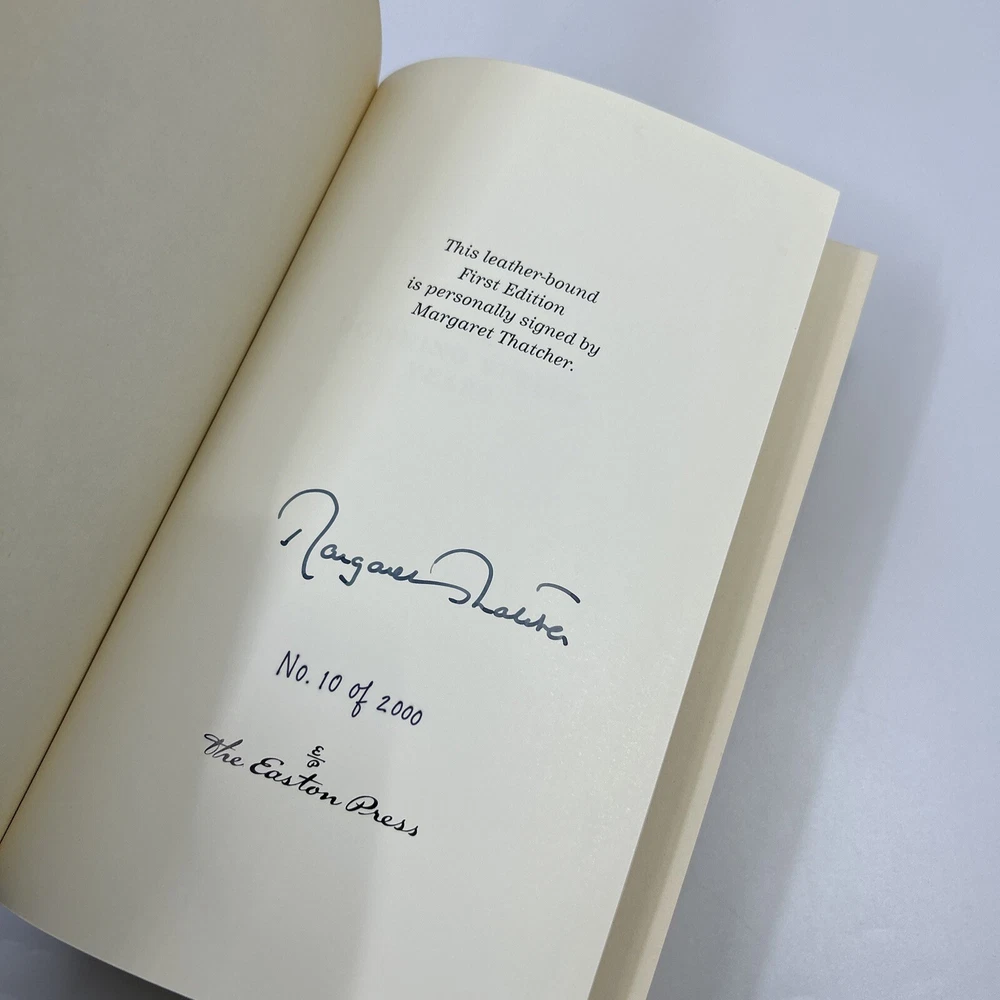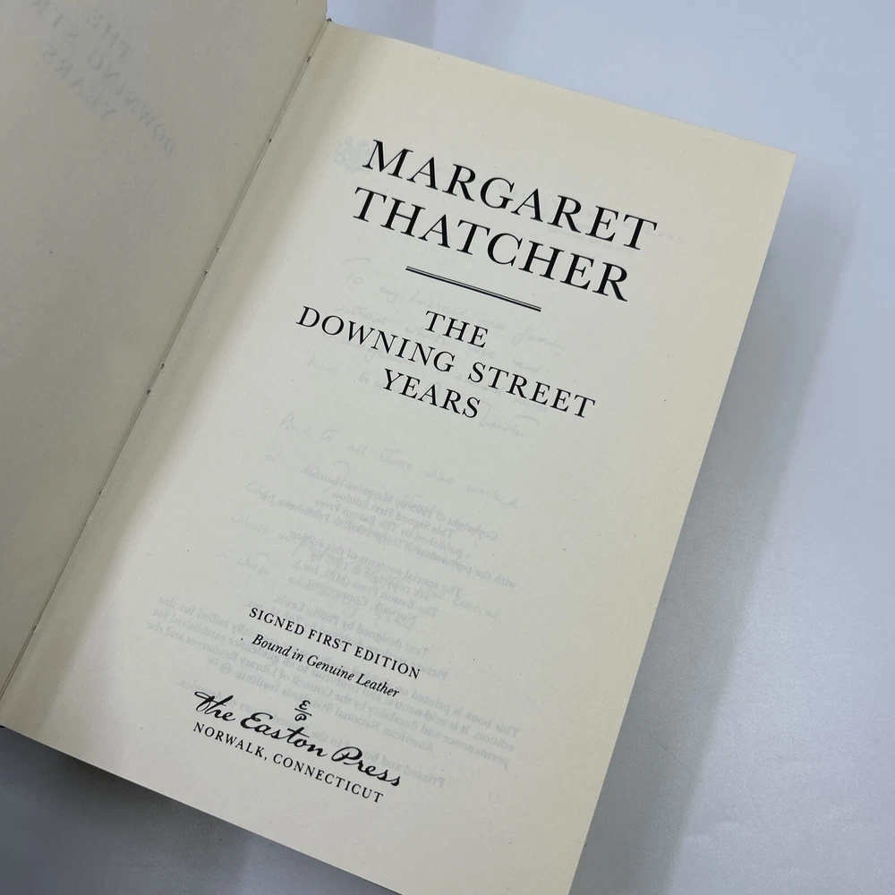 >>> GET IT NOW & ADD IT TO YOUR LIBRARY TODAY! <<< Leather-bound Easton Press collector's SIGNED FIRST EDITION of The Downing Street Years by Margaret Thatcher (SFE) Limited to 2000 hand-numbered copies personally signed by The Iron Lady, Margaret Thatcher Low #10, which also is the street number of the official residence and the office of the British Prime Minister - 10 Downing Street Condition – Very Good/Excellent; no attached bookplate/no embossed seal/no signatures or markings ; slight shelf wear/marks/scratches/rubbing to page gilt; slight shelf wear/marks/rubbing/bumps to leather covers with rubbing visible mostly to spine and spine ribs ; some peripheral fading to moire endsheets; no Certificate of Authenticity (COA) was published with this edition ; loose blank bookplate laid in; may have some dust from storage; please see all photos for details - photos are part of description; from an adult only smoke & pet free household; owl not included Shipping – boxed USPS Priority Mail; no international shipping (please do not ask) Payment – within two days from the listing's end (Best Offer acceptance) unless prior arrangements have been made No Returns/Sold 'As Is' – please contact me if you have any additional questions/issues or with requests for additional pictures >>> GET IT NOW & ADD IT TO YOUR LIBRARY TODAY! <<< *The only true First Editions (1 st Editions) from Easton Press you can be 100% certain about are books with “Signed First Edition " gilt-stamped on the leather spine or “Signed First Edition " printed on the title page and/or on the signature page. It is impossible to tell if any other Easton Press book is a first edition or first printing. Please keep that in mind and if not sure ask sellers for photos proving their claim. **Easton Press does not provide the actual print date in their books. For "Year Printed" the copyright date is listed (oftentimes from the original Heritage Press editions, rights to which were sold to Easton Press), which may or may not indicate an accurate range for manufacture of the book. ***Please note that Easton Press’s term Collector’s Edition is not synonymous with Limited Edition (LE). The only true Limited Editions from Easton Press are copies hand-numbered on the limitation page (i.e. ‘Number 1 of 1200’ or ‘This edition is strictly limited to a quantity of 1200 copies of which this is number 1’). Please keep that in mind and if not sure ask sellers to prove their claim.