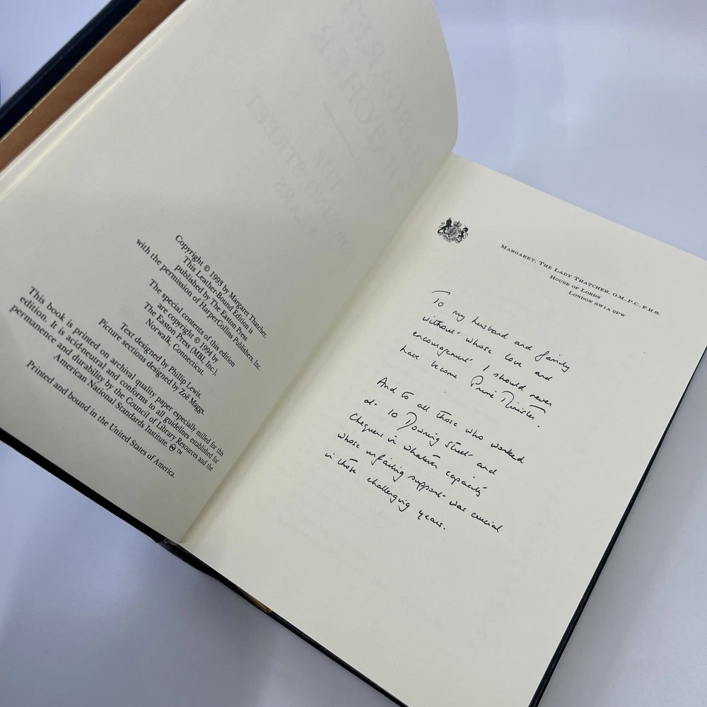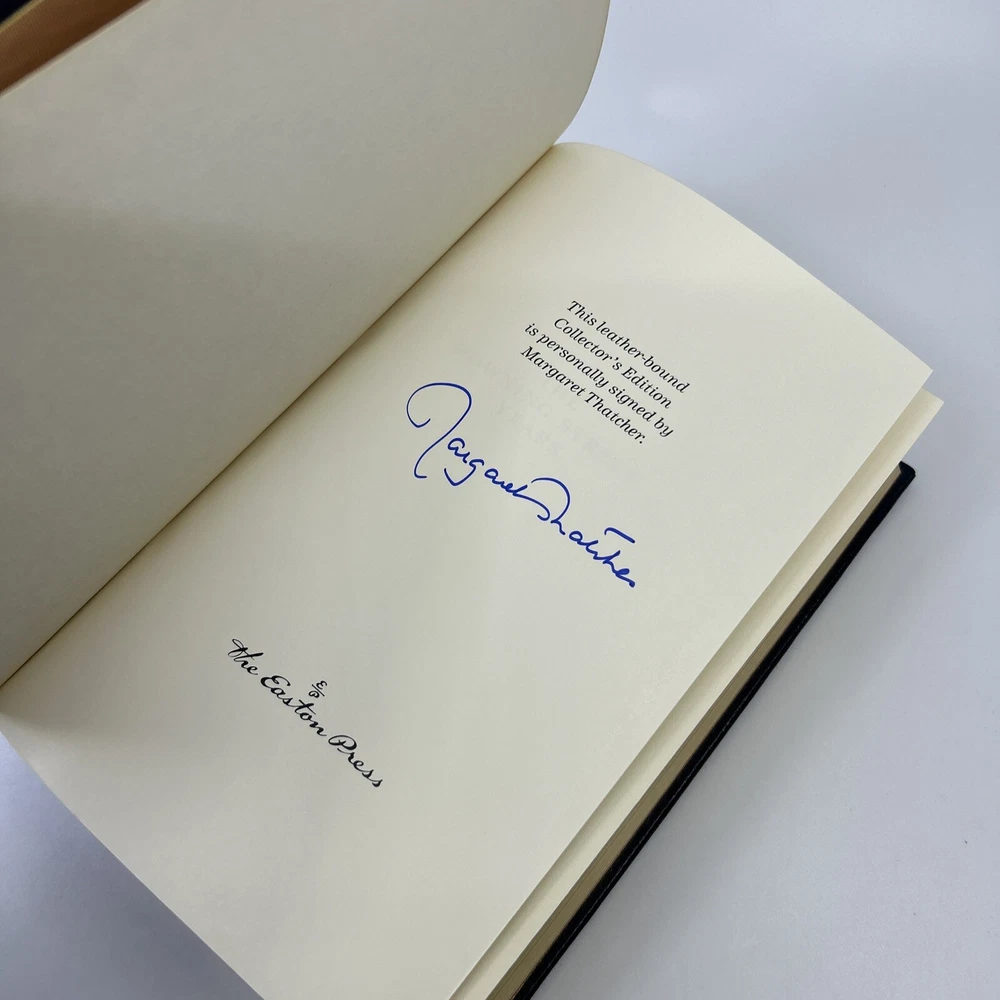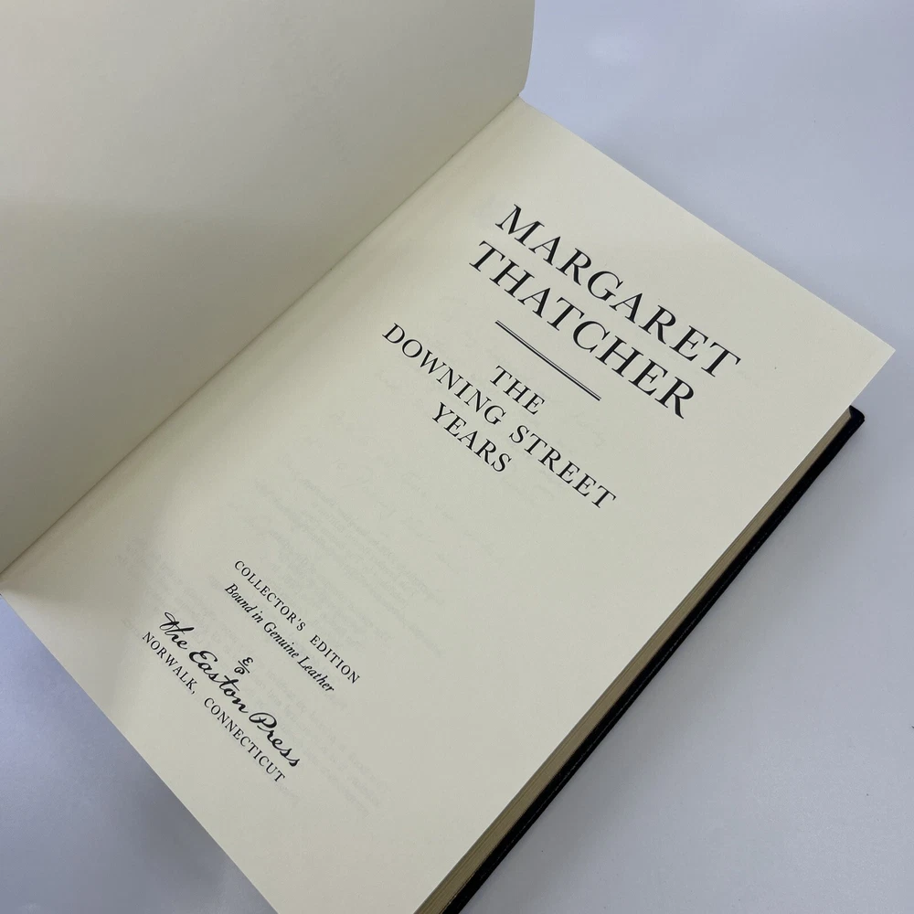 >>> GET IT NOW & ADD IT TO YOUR LIBRARY TODAY! <<< Leather-bound Easton Press collector's SIGNED EDITION of The Downing Street Years by Margaret Thatcher (SE) Personally signed by The Iron Lady, Margaret Thatcher Condition – Very Good/Excellent; no attached bookplate/no embossed seal/no signatures or markings ; slight shelf wear/marks/scratches/rubbing to page gilt; slight shelf wear/marks/rubbing/bumps to leather covers ; slight peripheral fading to moire endsheets; no Certificate of Authenticity (COA) was published with this edition ; loose blank bookplate laid in; may have some dust from storage; please see all photos for details - photos are part of description; from an adult only smoke & pet free household; owl not included Shipping – boxed USPS Media Mail or Priority Mail (selectable at checkout); no international shipping (please do not ask) Payment – within two days from the listing's end (Best Offer acceptance) unless prior arrangements have been made No Returns/Sold 'As Is' – please contact me if you have any additional questions/issues or with requests for additional pictures >>> GET IT NOW & ADD IT TO YOUR LIBRARY TODAY! <<< *The only true First Editions (1 st Editions) from Easton Press you can be 100% certain about are books with “Signed First Edition " gilt-stamped on the leather spine or “Signed First Edition " printed on the title page and/or on the signature page. It is impossible to tell if any other Easton Press book is a first edition or first printing. Please keep that in mind and if not sure ask sellers for photos proving their claim. **Easton Press does not provide the actual print date in their books. For "Year Printed" the copyright date is listed (oftentimes from the original Heritage Press editions, rights to which were sold to Easton Press), which may or may not indicate an accurate range for manufacture of the book. ***Please note that Easton Press’s term Collector’s Edition is not synonymous with Limited Edition (LE). The only true Limited Editions from Easton Press are copies hand-numbered on the limitation page (i.e. ‘Number 1 of 1200’ or ‘This edition is strictly limited to a quantity of 1200 copies of which this is number 1’). Please keep that in mind and if not sure ask sellers to prove their claim.