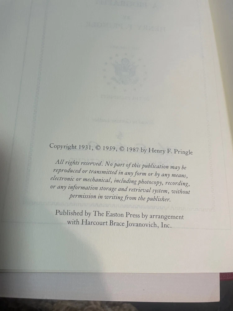 This collector's edition of "Theodore Roosevelt: A Biography" by Henry F Pringle is a must-have for any book enthusiast. The leather bound book, published by Easton Press in 1987, is a rare find that will make a great addition to any collection. The book details the life of one of the most iconic US presidents and is a perfect subject for anyone interested in biography and autobiography. The book is in great shape and is a valuable addition to any antiquarian and collectible book collection.