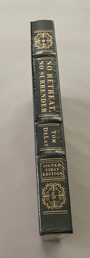 Tom DeLay No Retreat, No Surrender Signed First Edition Easton Press Leatherbound Collector's Edition Beautiful leatherbound book from Easton Press featuring a traditional hubbed spine, 22-kt. gold accents on the cover and spine, a satin ribbon page marker, silk moire endpapers, archival paper, and all edges gilt. Book is SIGNED by the author on a special signature page. Book is in new condition (in publisher's shrinkwrap).